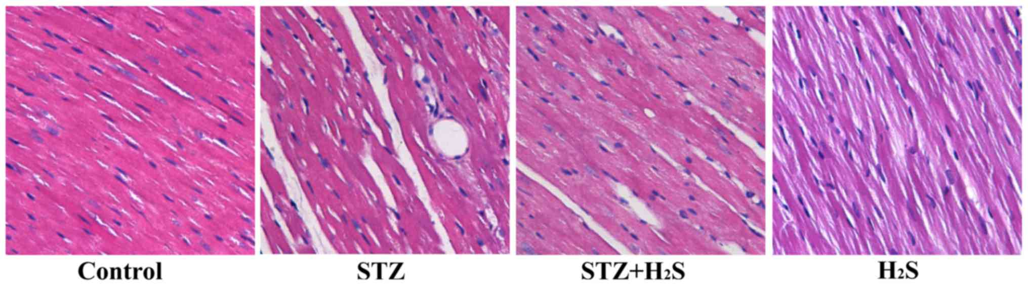 Plasma glucose concentration, BW and HW were measured prior to sacrificing the rats. The results revealed that BW and HW in the STZ-treated groups were significantly lower compared with those in the control group. The concentration of blood glucose was significantly increased in the STZ-treated group compared with that in the control group. However, no significant differences in BW, HW or blood glucose concentration were observed between the H2S-treated and STZ groups (Table I).