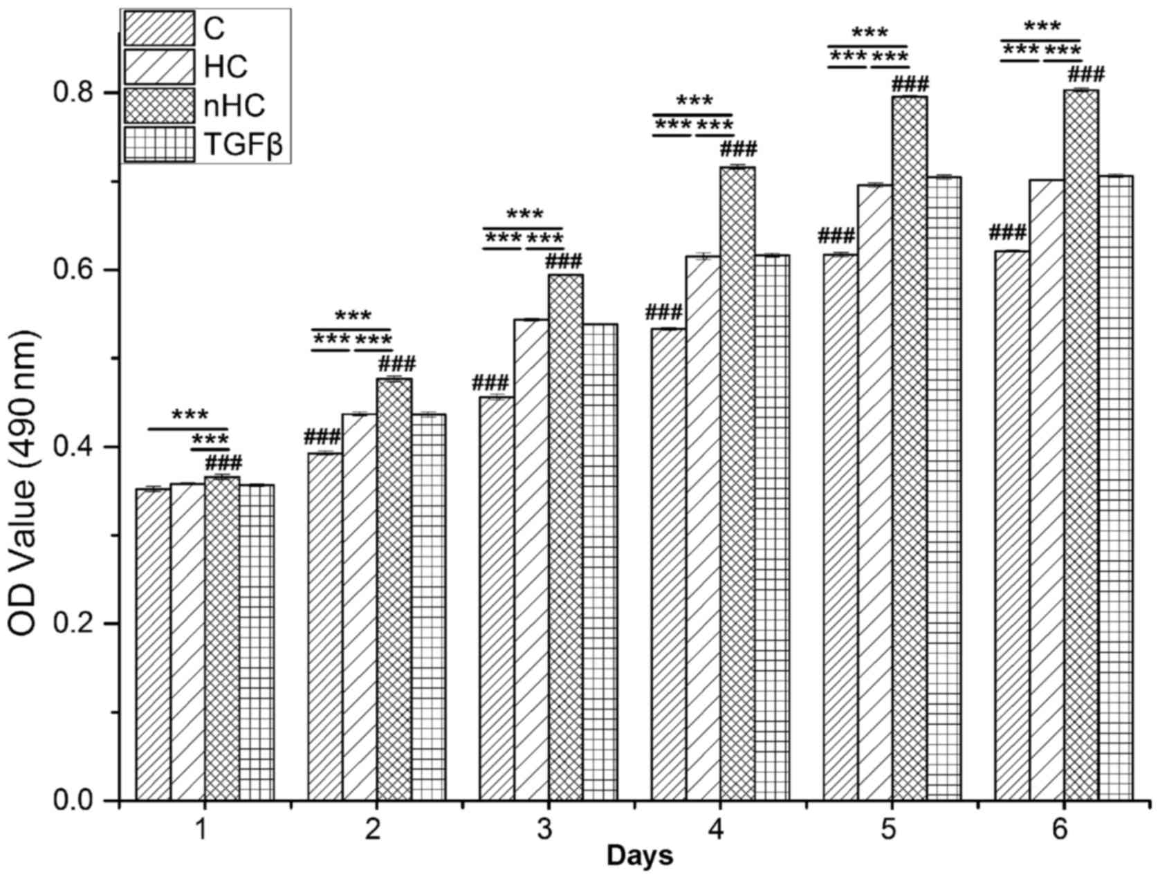 The proliferation of the cells was observed by methyl thiazolyl tetra zolium (MTT) assay (Sigma-Aldrich; Merck KGaA). Briefly, chondrocytes (5,000 cells/well) were cultured in 96-well microplates coated with collagen, HC or nHC film for 1, 2, 3, 4, 5 and 6 days. MTT (20 µl; 5 mg/ml) was added into the culture medium (200 µl) in each well. Following incubation for 4 h at 37°C, the medium supernatant was removed carefully and dimethyl sulfoxide was added (150 µl/well). The optical density (OD) was detected by a microplate reader at 490 nm.