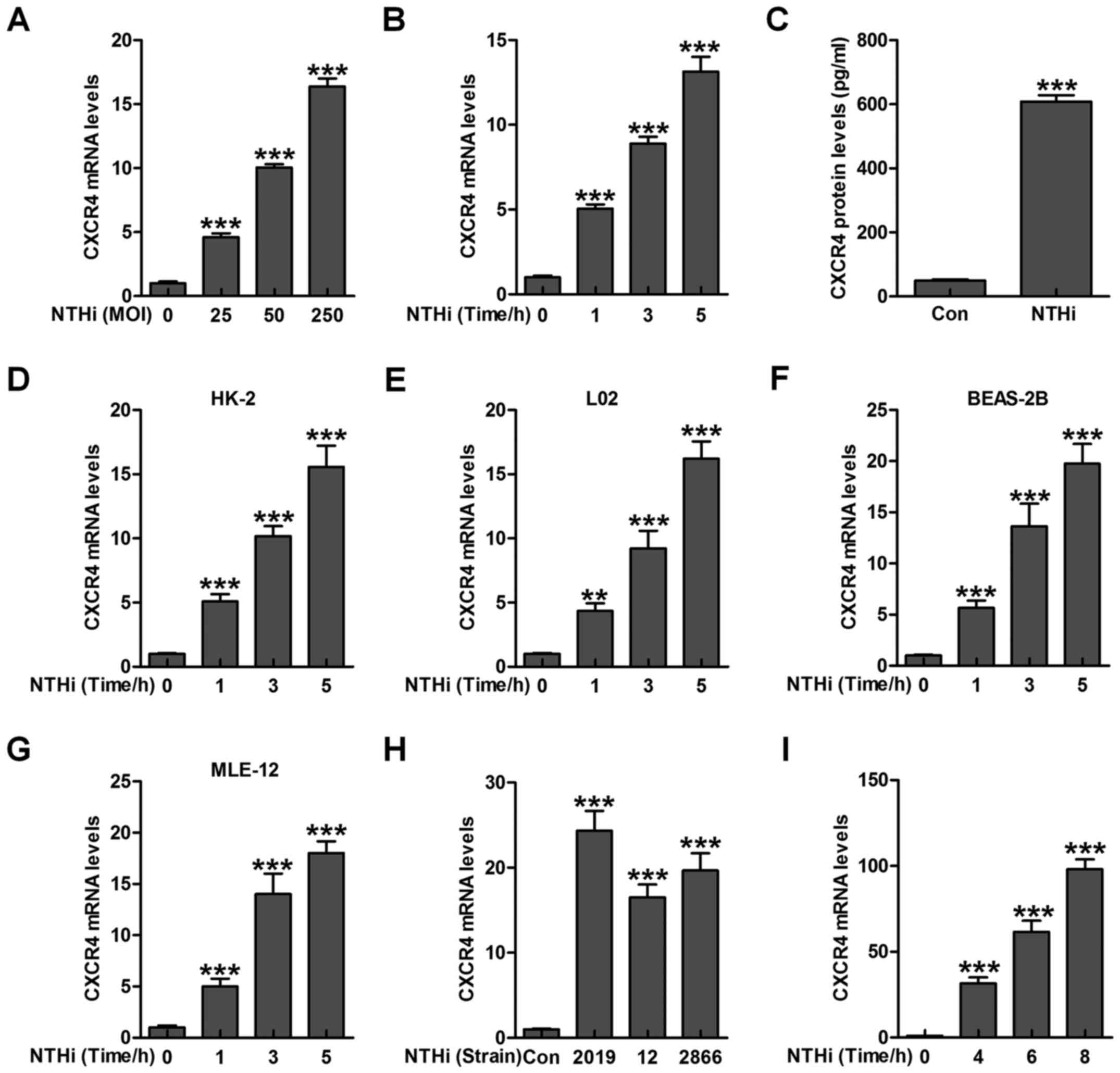 Epithelial cells are reported to be of great importance against various injuries under different stresses through inflammation response regulation (18,19). Hence, here we attempted to calculate if NTHi could induce CXCR4 activation in epithelial cells from human middle ear (HMEEC). As shown in Fig. 1A and B, CXCR4 expression was highly activated after NTHi stimulation, shown in a dose- and time-dependent manner. In addition, CXCR4 protein levels in HMEEC cells were significantly upregulated due to NTHi exposure through ELISA method (Fig. 1C). Moreover, CXCR4 levels in human renal epithelial HK-2 cells, human liver epithelial L02 cells, human lung epithelial BEAS-2B cells as well as in the mouse lung epithelial MLE-12 cells were detected by RT-qPCR assays. CXCR4 gene levels were highly upregulated in HMEECs after NTHi stimulation in a time-dependent manner (Fig. 1D–G). Another two stains of NTHi, 12 and 2866, reported to be effective in inducing otitis media, were also used to investigate whether CXCR4 could be upregulated. As shown in Fig. 1H, increased CXCR4 mRNA levels were observed in NTHi-induced HMEECs compared to the Con group. Consistently, CXCR4 mRNA levels were also stimulated in the mouse middle ear tissue samples induced by NTHi (Fig. 1I). Collectively, the data above indicated that CXCR4 may be of essential importance in NTHi-induced otitis media.