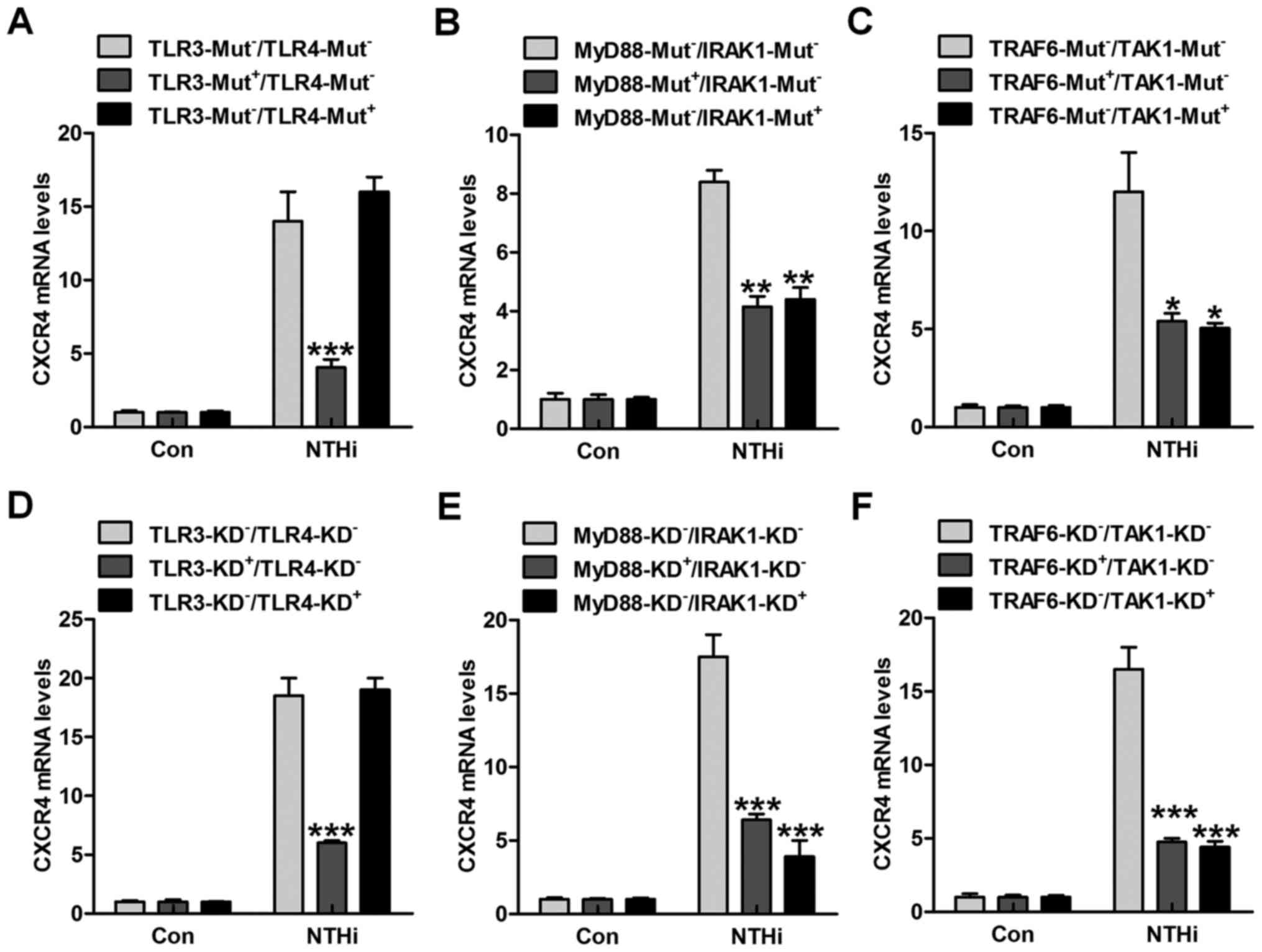 TLRs are well known as vital cell surface receptors, playing an essential role in regulating inflammation response against various pathogens under different conditions (20). Up until now, ~13 TLRs have been reported. Among these receptors, TLR3 and TLR4 are significant in realizing LPS, which is a Gram-negative bacteria characteristic (21). TLRs are involved in NTHi-induced inflammatory response, which may be also related to CXCR4 activation. Thus, here the HMEECs were transfected with TLR3 and TLR4 mutants. Of note, TLR3 mutant in high expression apparently reduced NTHi-induced CXCR4 expression at the gene levels (Fig. 2A). However, no significant difference related to CXCR4 expression was observed in TLR4-mutation cells after NTHi stimulation compared to the TLR3-Mut−/TLR4-Mut− group. The TLRs down-streaming signals, MyD88/IRAK1, and TRAF6/TAK1 were also investigated. As shown in Fig. 2B and C, we found that both MyD88 and IRAK1 mutations downregulated CXCR4 mRNA levels in NTHi-treated cells. Also, TRAF6/TAK1 mutations dramatically decreased CXCR4 mRNA expression through RT-qPCR analysis. Moreover, depletion of TLR3 with TLR3 siRNA also decreased CXCR4 expression from the gene levels. In the results above, TLR4 knockdown showed no significant difference on CXCR4 gene expression (Fig. 2D). Furthermore, MyD88 and IRAK1 silence through specific RNA knockdown reduced CXCR4 expression in HMEECs after NTHi induction (Fig. 2E). Finally, in order to further confirm TRAF6 and TAK1 in CXCR4 regulation, we found that TRAF6 and TAK1 silence considerably reduced CXCR4 gene expression levels (Fig. 2F). The data above indicated that TLR3/MyD88/IRAK1/TRAF6/TAK1 signaling pathway was, at least partly, involved in NTHi-induced otitis media.