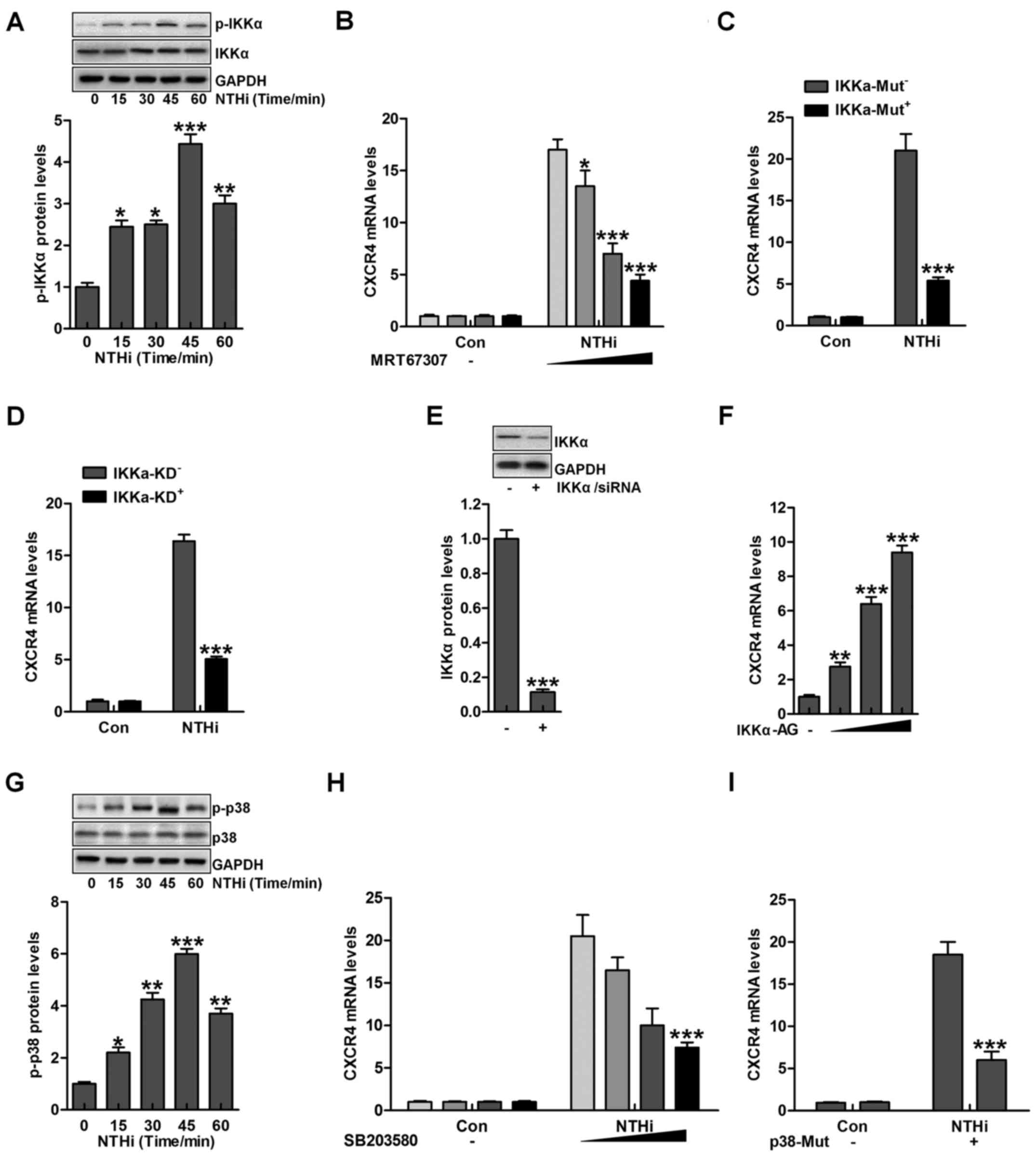 According to previous studies, IKKα and p38 MAPK are two important signaling pathways in regulating otitis media progression induced by NTHi (22). IKKα is considered as an essential molecule, activated by TLRs/MyD88 signaling pathway, contributing to inflammation response (23). As shown in Fig. 3A, we found that IKKα phosphorylation was upregulated due to NTHi stimulation. Next, IKKα inhibitor MRT67307, was used to suppress IKKα expression, and with the increasing of MRT67307 concentration, CXCR4 mRNA levels were reduced, which was comparable to the NTHi-treated group in the absence of MRT67307 (Fig. 3B). Moreover, IKKα mutation significantly reduced CXCR4 mRNA levels in HMEECs stimulated by NTHi (Fig. 3C). Similarly, IKKα knockdown indicated that CXCR4 mRNA levels were decreased after NTHi stimulation (Fig. 3D). Fig. 3E suggested that IKKα was successfully silenced for knockdown to inhibit its activation. In contrast, IKKα activator was used to improve its phosphorylation, leading to CXCR4 upregulation in a dose-dependent manner (Fig. 3F). Additionally, p38 phosphorylated levels were evaluated after NTHi stimulation in HMEECs. p38 phosphorylation was also upregulated with the increasing time of NTHi induction (Fig. 3G). Further, p38 inhibitor SB203580 usage reduced CXCR4 mRNA levels in a dose-dependent manner (Fig. 3H). Finally, p38 mutation was included to decrease CXCR4 mRNA levels through RT-qPCR analysis (Fig. 3I). The data above illustrated that IKKα and p38 signaling pathways were included in NTHi-induced otitis media.
