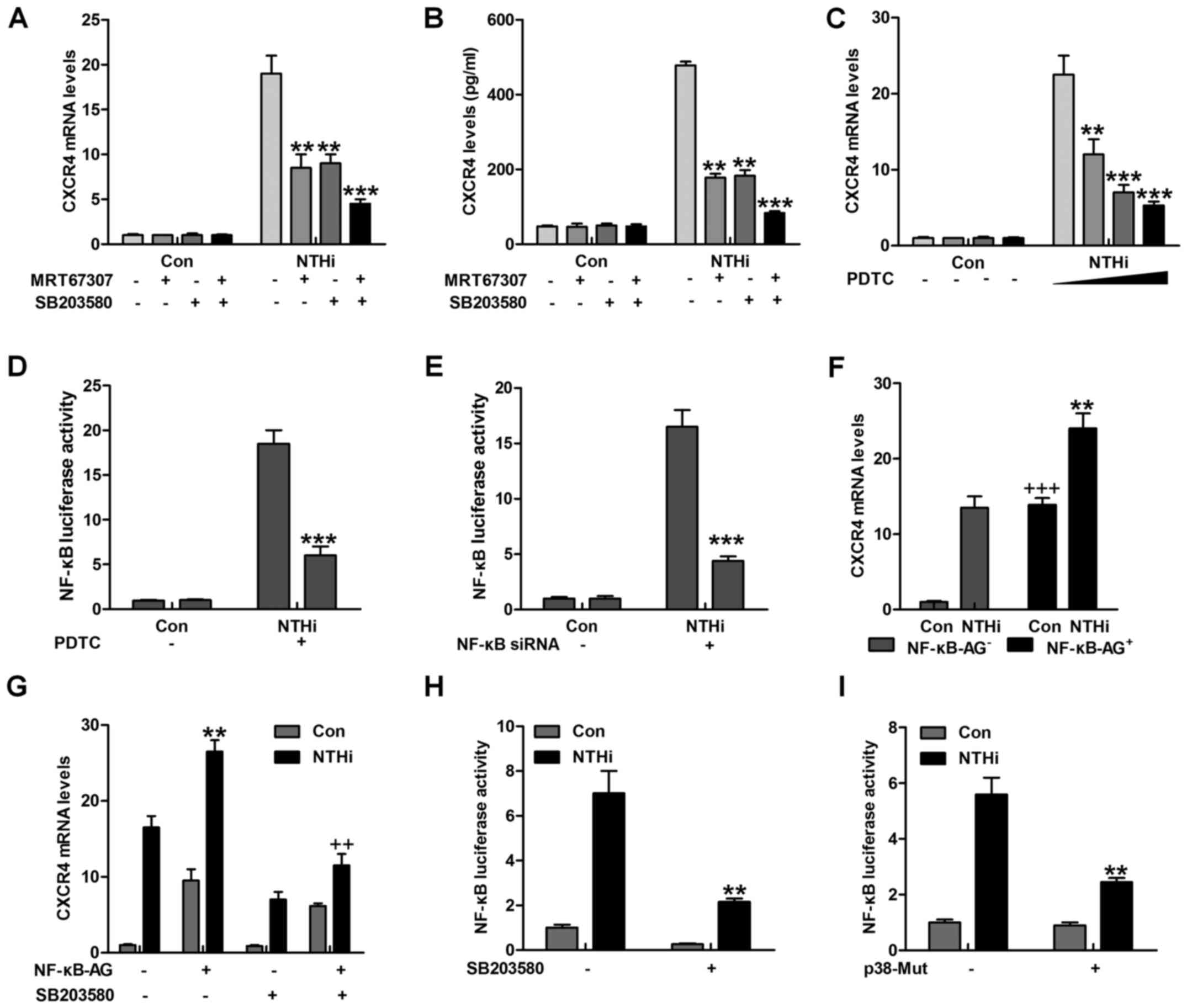 The findings above revealed that IKKα and p38 had a close relationship with otitis media (24). NF-κB is known as an essential signal in regulating inflammation response, which is regulated by IKKα activity (25). As shown in Fig. 4A and B, CXCR4 gene and protein levels were significantly reduced for MRT67307 and SB203580 treatment alone, especially in combination. Of note, NF-κB inhibitor, PDTC, was used here to suppress NF-κB activation. CXCR4 mRNA levels were highly reduced, particularly in the highest concentration of PDTC (Fig. 4C). Pretreatment with PDTC markedly abolished NTHi-triggered NF-κB promoter-induced luciferase activity (Fig. 4D). Depletion of NF-κB by the use of NF-κB siRNA, reduced CXCR4 mRNA expression levels (Fig. 4E). Notably, Fig. 4F overexpression of NF-κB further promoted NTHi-triggered CXCR4 mRNA expression. In oder to calculate if p38 triggers CXCR4 expression through NF-κB, HMEECs were transfected with NF-κB combined with SB203580 or not, prior to stimulation by NTHi. SB203580 reduced CXCR4 mRNA expression in NF-κB-transfected HMEECs (Fig. 4G). In addition, pretreatment with SB203580 apparently reduced NTHi-stimulated NF-κB promoter-driven luciferase activity, which as shown in Fig. 4H. p38 mutation decreased NF-κB promoter activity induced by NTHi (Fig. 4I). The data above indicated that p38-regulated CXCR4 expression induced by NTHi relied on NF-κB signaling pathway.