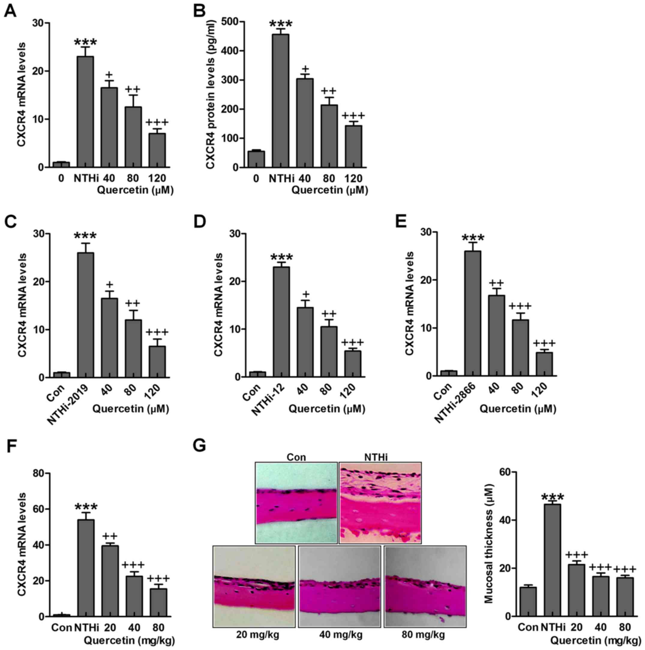The findings above indicated the possible molecular mechanism by which otitis media was induced for NTHi, which was related to CXCR4 expression levels. Quercetin has been reported before to have an essential role in suppressing inflammation response through various signaling pathways, including TLR4/NF-κB and MAPKs (26). Thus, we attempted to explore if quercetin could improve NTHi-induced otitis media in vivo and in vitro through targeting CXCR4. As shown in Fig. 5A and B, after NTHi stimulation, overexpressed CXCR4 gene and protein levels were reduced for quercetin administration in a dose-dependent manner. Also, in other NTHi strains, 2019, 12 and 2866, CXCR4 high expression was significantly downregulated for quercetin treatment under different concentrations in HMEECs stimulated by NTHi (Fig. 5C–E). Finally, in in vivo study, we found that CXCR4 mRNA levels in the middle ear of mice were upregulated by NTHi induction, which was downregulated for quercetin treatment in a dose-dependent manner (Fig. 5F). The histologic sections and the mucosa thickness in the mouse middle ear were observed through H&E staining (Fig. 5G). By assessment, the mucosa in the roof of NTHi-treated mice with otitis media was much thicker compared to the control ones, which was reduced for quercetin treatment at different concentrations. The data above indicated that quercetin has potential value for ameliorating NTHi-induced inflammation seen in otitis media.