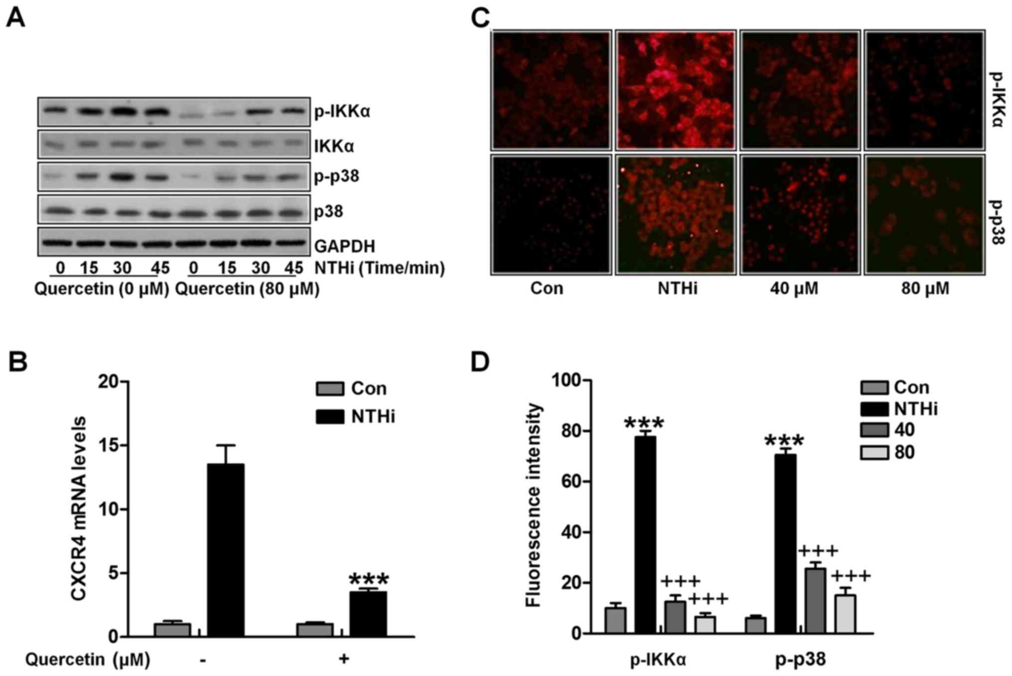 Quercetin, an important flavonoid antioxidant, found in red apples as well as broccoli, rutin and green tea, helps blood pressure balance, fight asthma and allergies, and prevents angiocardiopathy and tumor progress (11,12). Quercetin as a well-known flavonoid with various biological effects has been widely used and evidenced in many disease models. Due to the tolerability and non-toxicity of quercetin, it could be used for prolonged periods in the absence of any side effects (13,14). However, though it is well known in suppressing inflammation response, the effect of quercetin on otitis media improvement through CXCR4 modulation is unknown. In the study, we explored the possible molecular mechanism of NTHi-stimulated CXCR4 expression. NTHi increases CXCR4 expression through IKKα and p38 MAPK signaling pathways activation. In addition, quercetin inhibited CXCR4 expression induced by NTHi in human middle ear epithelial cells as well as in tissue samples. Quercetin inhibited CXCR4 expression through inactivating IKKα and p38 MAPK phosphorylation, providing effective therapeutic strategy for otitis media treatment by inhibiting CXCR4 expression.