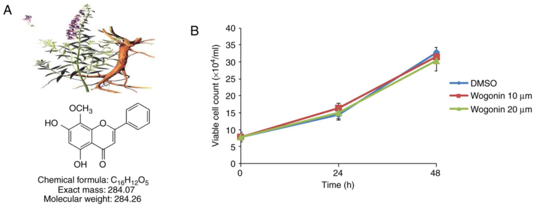 Cell viability was assessed by cell counting assays. Briefly, 5×104 cells per well were plated in a 12-well plate and incubated in complete culture medium prior to drug exposure. After 24 or 48 h of treatment, aliquots were removed, and viable cells were counted in triplicate by trypan blue (Sigma-Aldrich; Merck KGaA) exclusion. Based on the results of the cytotoxicity assay, a nontoxic concentration of wogonin was selected to use on the MDA-MB-231 cells in subsequent experiments.