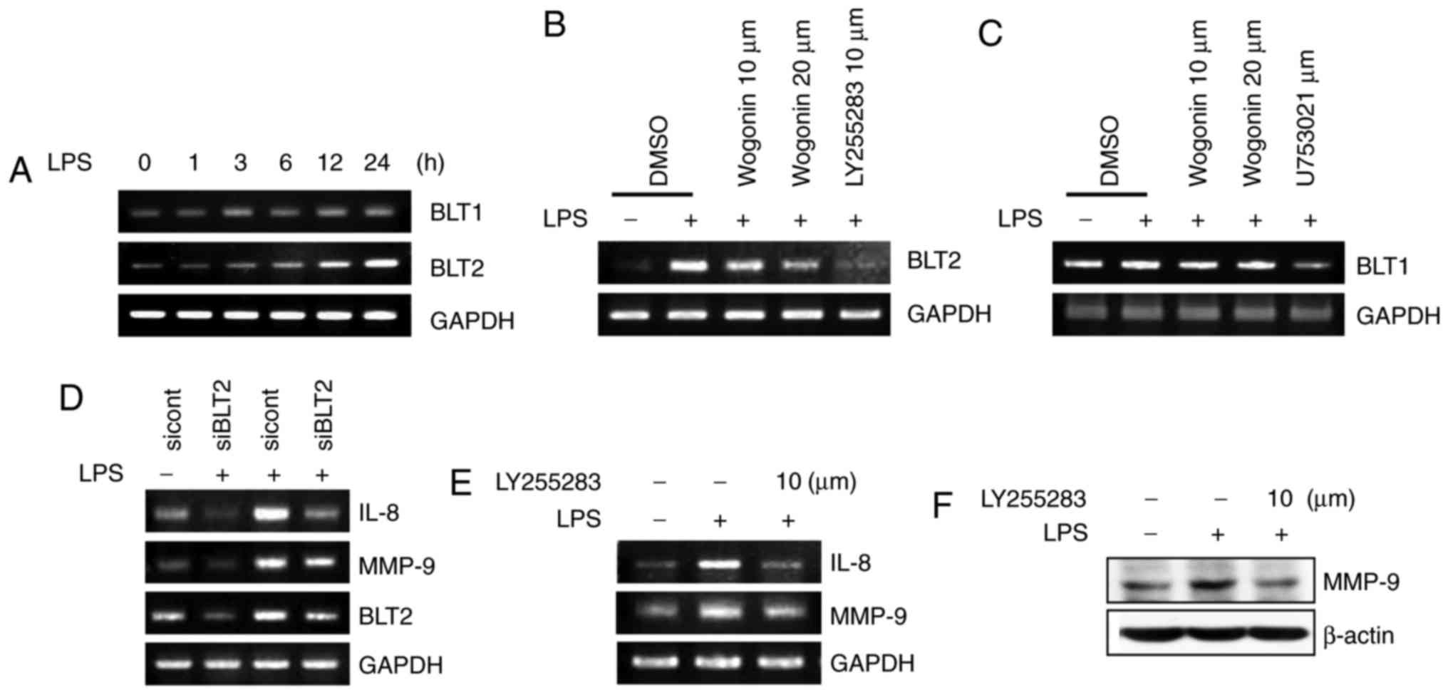 Next, the results demonstrated that LPS stimulation resulted in upregulated BLT2 mRNA levels in MDA-MB-231 breast cancer cells (Fig. 3A), consistent with previous reports (13). Semiquantitative RT-PCR revealed that LPS markedly increased BLT2 mRNA levels in a time-dependent manner, but had little impact on BLT1 expression (Fig. 3A). Thus, the hypothesis that wogonin may suppress BLT2 expression was examined. Wogonin clearly suppressed LPS-induced BLT2 mRNA expression in a dose-dependent manner (Fig. 3B), but did not have an effect on BLT1 expression (Fig. 3C). Previous reports suggested that the BLT2 cascade contributes to the production of IL-8 and MMP-9 (3,13,29). Furthermore, BLT2 depletion using siRNA has been reported to attenuate the LPS-induced invasive activity of MDA-MB-231 cells (13). In agreement with these results, BLT2 depletion using siRNA, or the selective BLT2 antagonist LY255283, clearly attenuated LPS-induced IL-8 and MMP-9 mRNA and protein expression in MDA-MB-231 cells (Fig. 3D–F); however, the BLT1 antagonist U75302 did not exert such effects (data not shown). These results suggest that BLT2 may be the effector for the wogonin anti-invasion activity.