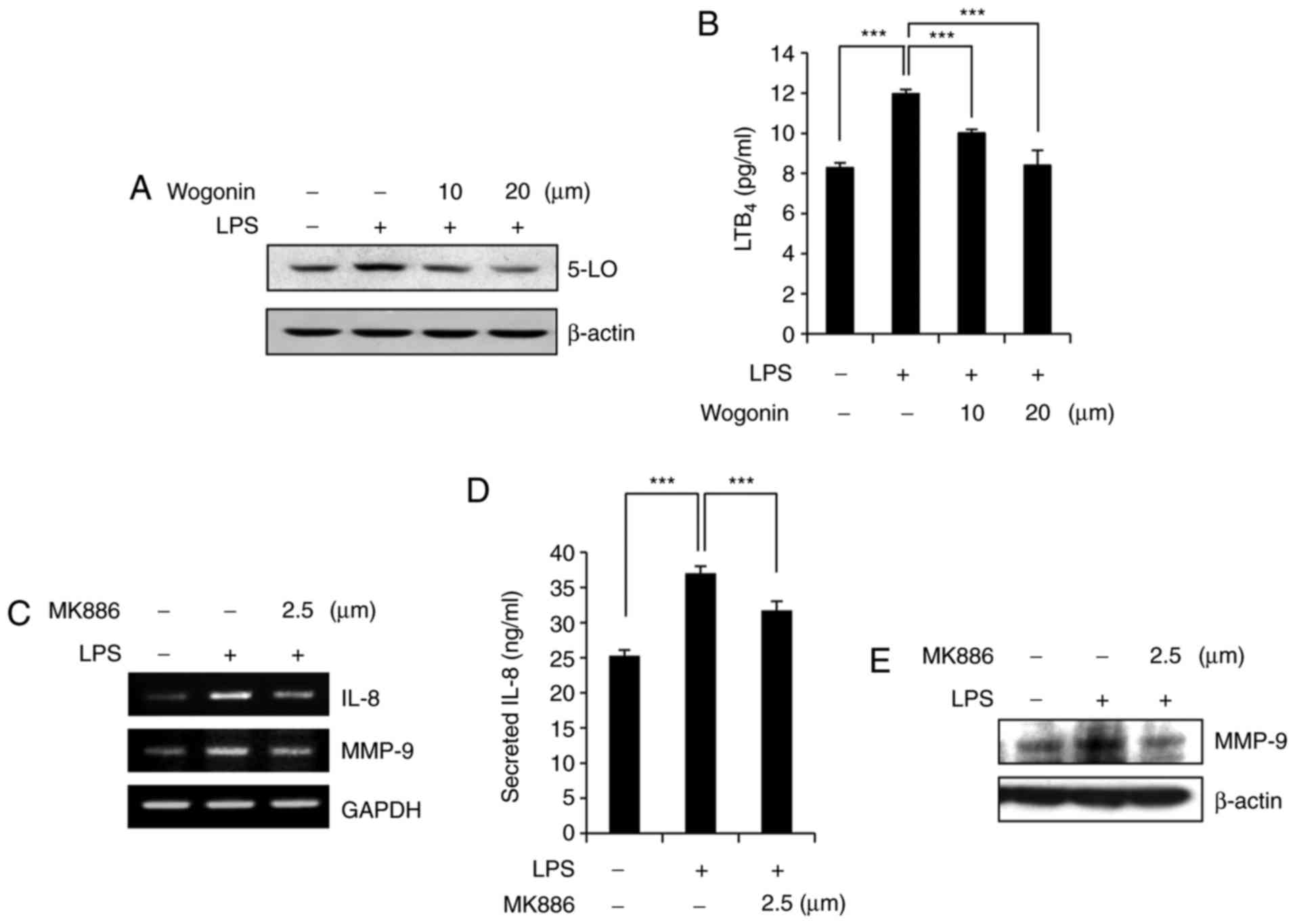 Recent studies have suggested that 5-LO expression was increased in response to LPS stimulation in MDA-MB-231 cells (13,30). Thus, whether wogonin affects the expression of 5-LO and its metabolite, LTB4, was examined in LPS-treated MDA-MB-231 cells. 5-LO expression was markedly inhibited by wogonin treatment in LPS-stimulated MDA-MB-231 cells (Fig. 4A). In addition, wogonin significantly inhibited LPS-induced production of the 5-LO metabolite LTB4 (Fig. 4B). Under the same experimental conditions, LPS-induced IL-8 and MMP-9 expression was suppressed by pretreatment with the 5-LO-activating protein (FLAP) inhibitor, MK886 (Fig. 4C–E). Taken together, these results suggest that wogonin inhibits 5-LO and thus attenuates the production of its metabolite, LTB4, and the subsequent synthesis of IL-8 and MMP-9.