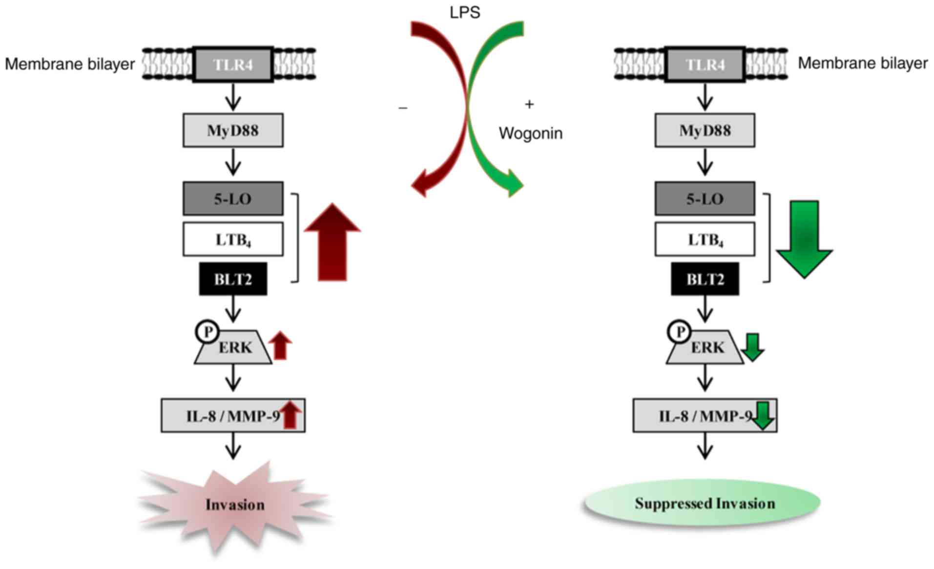 In summary, the present study demonstrated that wogonin suppressed the ability of LPS to stimulate the invasiveness and metastasis of MDA-MB-231 cells. Furthermore, the results revealed that the molecular mechanism responsible for the effects of wogonin may be associated with the 5-LO/BLT2/ERK/IL-8/MMP-9 cascade (Fig. 7). Thus, the 5-LO-/BLT2 axis is a novel pathway through which wogonin may exert its anti-invasive actions in LPS-stimulated MDA-MB-231 cells.