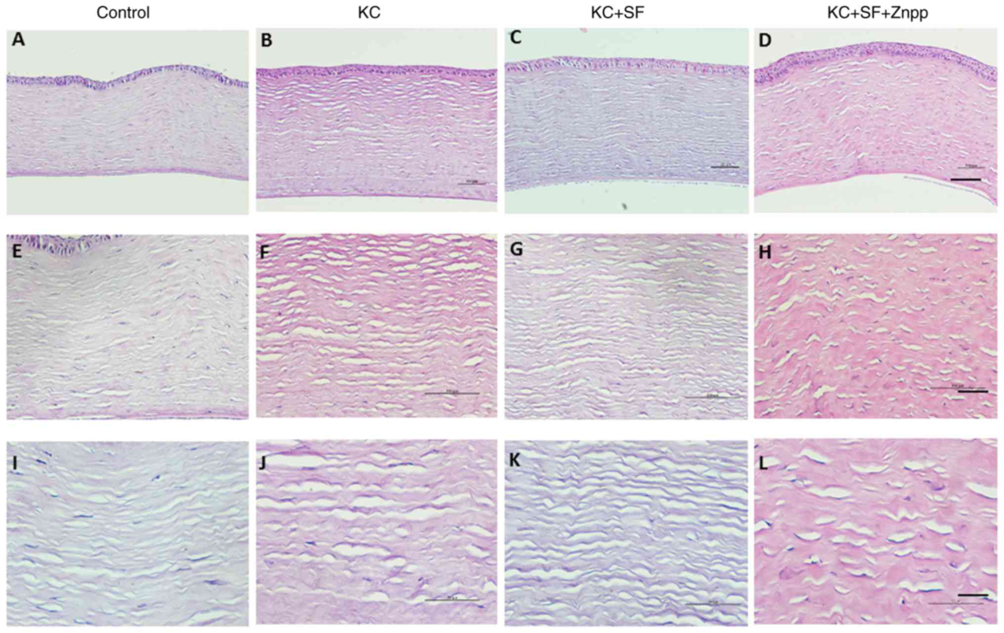 No obvious inflammatory reaction was observed in any of the rabbits following the procedure in the four experimental groups (Control, KC, KC + SF, and KC + SF + ZnPP groups). The results of the H&E staining indicated that the corneal tissue structures of the four experimental groups were intact at day 14 post-surgery, and the cell morphology was normal (Fig. 1). The corneal endothelial cells were lost in certain tissues due to section preparation and other reasons. The corneal epithelium in the four groups consisted of 5-6 layers of stratified squamous epithelium, and was closely connected with the stroma, suggesting that the epithelium had returned to normal (Fig. 1A-D). Compared with the Control group, the corneal stromal fibers were loosely arranged and the gap between the collagen fibers was increased in the KC group. Compared with the Control group, there was no marked change in the corneal tissue structures of the KC + SF and KC + SF + ZnPP groups (Fig. 1E-L). SF treatment did not visibly change the corneal structure.