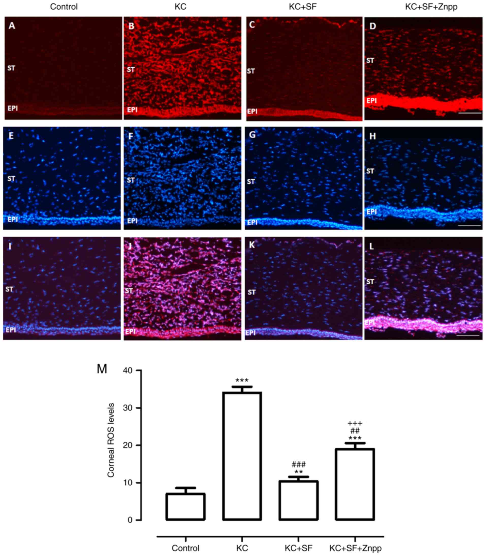 The production of ROS in fresh corneas was measured with DHE staining in all groups. As shown in Fig. 3, the basal level of ROS was low in the Control group corneas (Fig. 3A). However, ROS generation was increased markedly in the KC corneas (Fig. 3B), and this effect was decreased with SF treatment (Fig. 3C). The production of ROS was enhanced in the KC + SF + ZnPP group (Fig. 3D). Representative images of corneal sections stained with DAPI were obtained from each group (Fig. 3E-H). The merged images with double-label immunofluorescent staining using antibodies against DHE and DAPI are shown in Fig. 3I-L. ROS level analysis in the stroma of the cornea was consistent with the immunofluorescent results (Fig. 3M, n=4 per group).