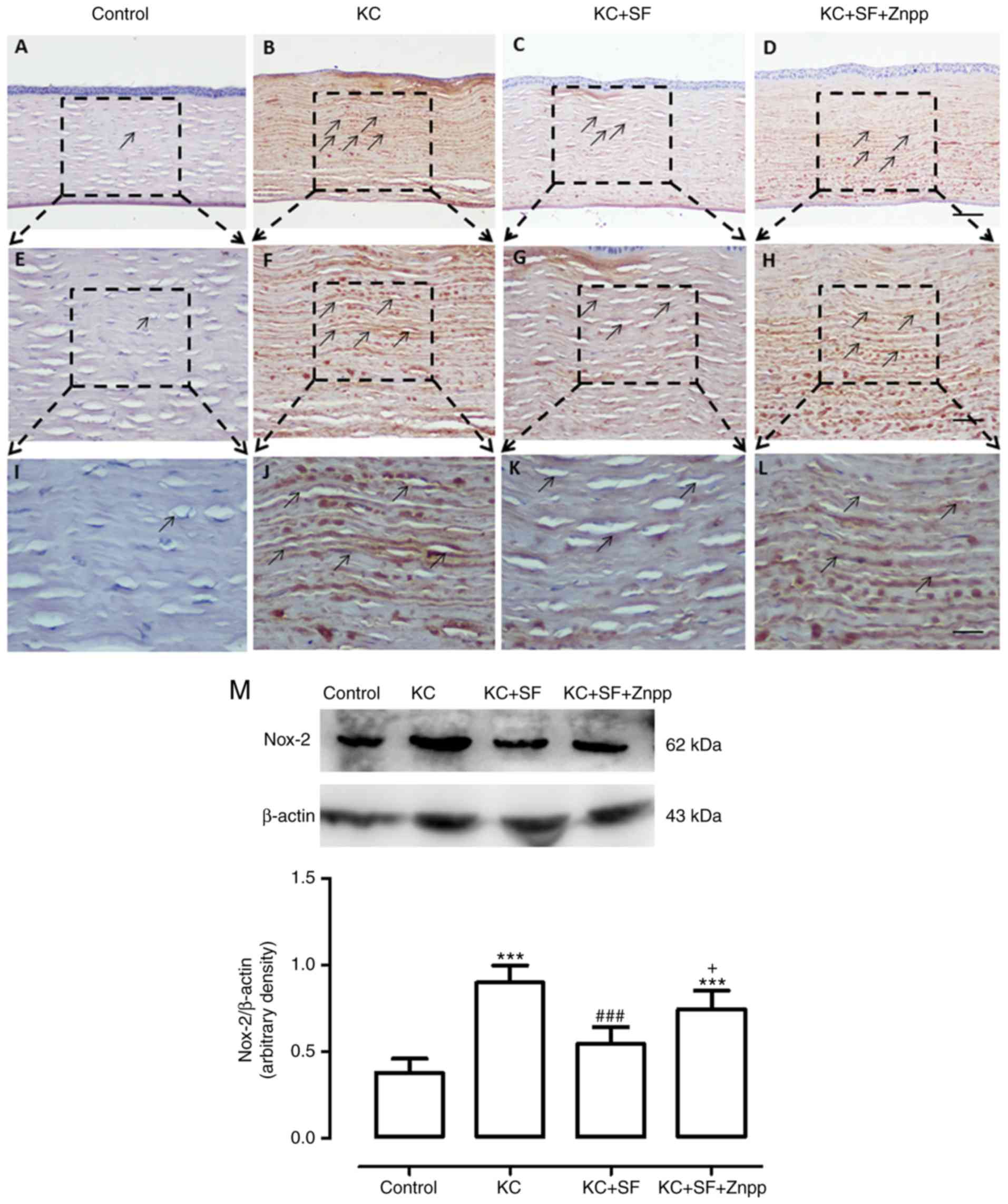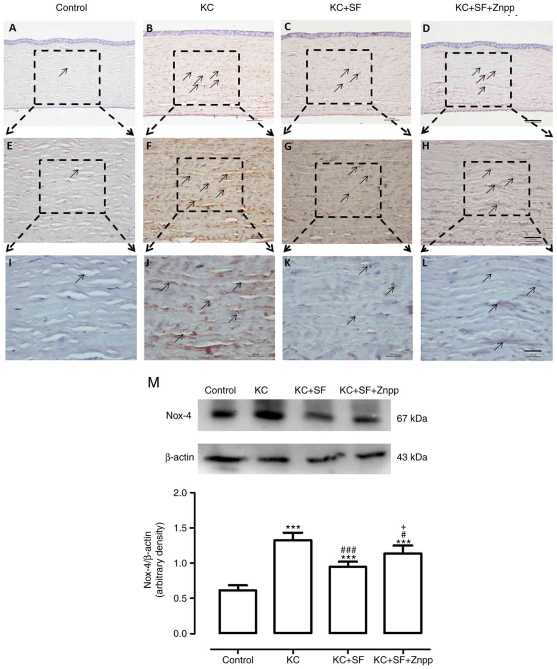 The Nox family of proteins is considered to be one of the most important ROS sources in the cornea, and Nox-2 and Nox-4 proteins are expressed at high levels in the corneal stromal cells of patients with KC (8,27). Therefore, changes in the expression of Nox-2 and Nox-4 were evaluated in the corneas of the four experimental groups (n=4 per group). Images of the results are shown in Fig. 4A-L. The Control group had relatively low Nox-2 immunoreactivity throughout the cornea (Fig. 4A, E and I). In the KC group, there was more marked Nox-2 immunoreactivity throughout the entire cornea (Fig. 4B, F and J). The expression of Nox-2 in the KC + SF group was reduced compared with that in the KC group (Fig. 4C, G and K). The expression of Nox-2 in the KC + SF + ZnPP group was markedly enhanced compared with that in the KC + SF group (Fig. 4D, H and L). Western blot analysis revealed that the basal level of Nox-2 in the Control group corneas was lower than that in the KC group corneas. KC induced a significant increase in the expression of Nox-2 in the cornea (n=3, Fig. 4M; P<0.001). The level of Nox-2 in the KC + SF group was significantly decreased compared with that in the KC group (n=3, Fig. 4M; P<0.001). The level of Nox-2 in the KC + SF + ZnPP group was significantly increased compared with that in the KC + SF group (n=3, Fig. 4M; P<0.05). As shown in Fig. 5, the Control group exhibited relatively low Nox-4 immunoreactivity throughout the cornea (n=4, Fig. 5A, E and I). In the KC group, there was more marked Nox-4 immunoreactivity throughout the entire cornea (n=4, Fig. 5B, F and J). The expression of Nox-4 in the KC + SF group was more markedly decreased compared with that in the KC group (n=4, Fig. 5C, G and K). The expression of Nox-4 in the KC + SF + ZnPP group was enhanced compared with that in the KC + SF group (n=4, Fig. 5D, H and L). Western blot analysis revealed that the basal level of Nox-4 in the control cornea was lower than that in the KC cornea. KC induced a significant increase in the expression of Nox-4 in the cornea (n=3, Fig. 5M; P<0.001). The level of Nox-4 in the KC + SF group was significantly reduced compared with that in the KC group (n=3, Fig. 5M; P<0.001). The level of Nox-4 in the KC + SF + ZnPP group was enhanced significantly compared with that in the KC + SF group (n=3, Fig. 5M; P<0.05).