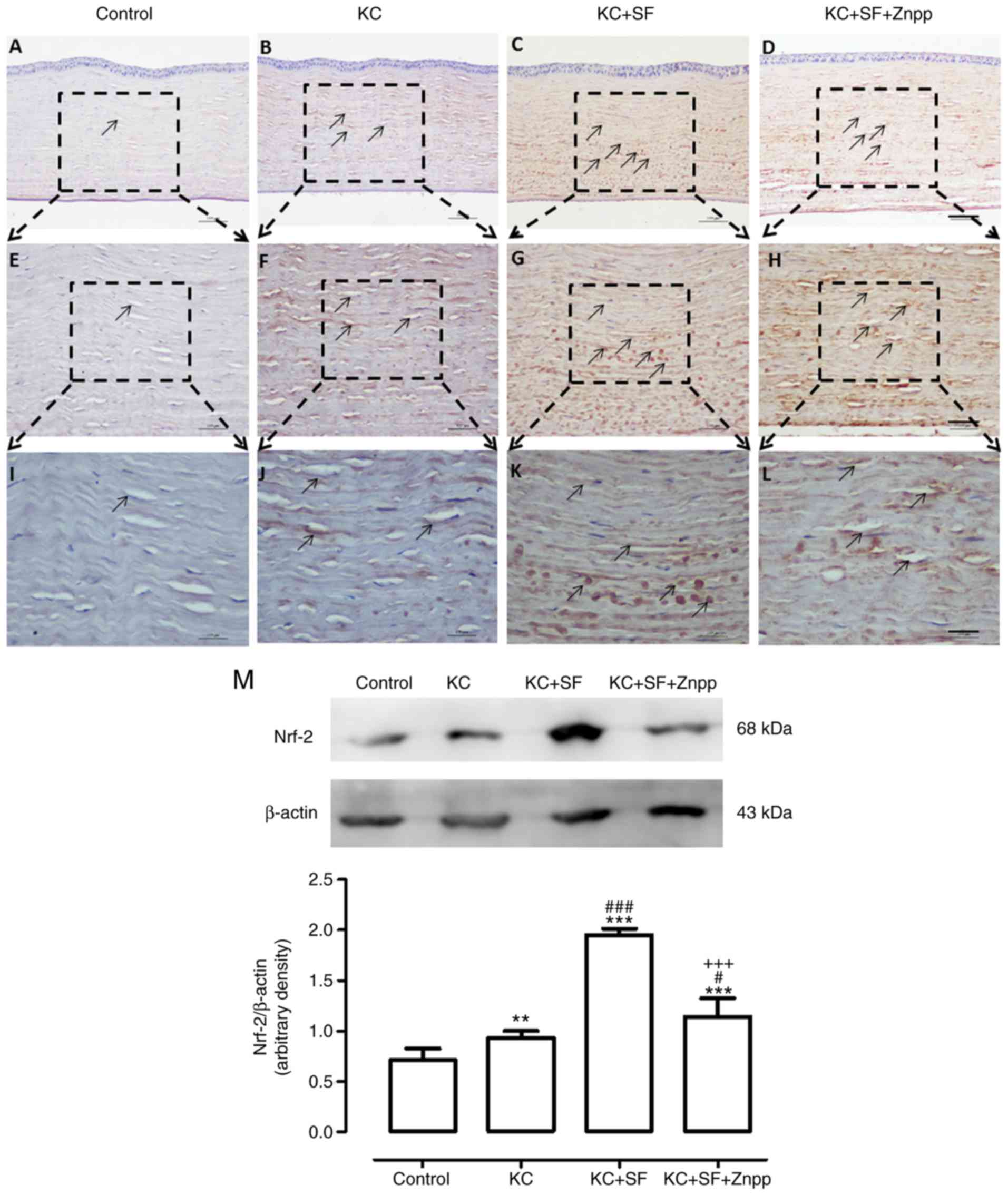 Under oxidative stress, Nrf-2 translocates into the cell nucleus and binds with ARE regions of the promoters of genes that encode antioxidant and phase II detoxifying enzymes to weaken cellular oxidative stress (28). Therefore, the present study examined whether the excessive free radicals in KC corneas were caused by the upregulation of Nrf-2. Images of staining are shown in Fig. 6A-L, The Control group exhibited relatively low Nrf-2 immunoreactivity throughout the cornea (n=4, Fig. 6A, E and I). In the KC group, there was higher Nrf-2 immunoreactivity throughout the entire cornea (n=4, Fig. 6B, F and J). The expression of Nrf-2 in the KC + SF group was increased more markedly compared with that in the KC group (n=4, Fig. 6C, G and K). The expression of Nrf-2 in the KC + SF + ZnPP group was lower, compared with that in the KC + SF group (n=4, Fig. 6D, H and L). Western blot analysis revealed that the basal level of Nrf-2 in the Control cornea was lower than that in the KC cornea. KC induced a significant increase in the expression of Nrf-2 in the corneas (n=3, Fig. 6M; P<0.01). The level of Nrf-2 in the KC + SF group was significantly higher compared with that in the KC group (n=3, Fig. 6M; P<0.001). The level of Nrf-2 in the KC + SF + ZnPP group was decreased significantly compared with that in the KC + SF group (n=3, Fig. 6M; P<0.001). SF-induced Nrf-2 pathway activation provided protection against corneal oxidative damage. ZnPP IX, the HO-1 inhibitor, reduced the activity of Nrf-2 on the KC + SF cornea.