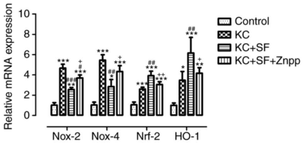 The expression levels of relevant antioxidant and oxidation genes, including Nox-2, Nox-4, Nrf-2 and HO-1, were evaluated in corneal stromal cells by RT-qPCR analysis in all experimental groups. As shown in Fig. 8, the RT-qPCR results indicated that, compared with the Control group, the mRNA expression levels of Nox-2, Nox-4, Nrf-2 and HO-1 in the KC group were significantly increased (n=3, all P<0.05), which was consistent with the results of the western blot analysis. The mRNA levels of Nox-2 and Nox-4 in the KC + SF group were decreased significantly compared with those in the KC group (n=3, Fig. 8; P<0.01). The mRNA levels of Nrf-2 and HO-1 in the KC + SF group were increased significantly compared with those in the KC group (n=3, Fig. 8; P<0.01). The mRNA levels of Nox-2 and Nox-4 in the KC + SF + ZnPP group were increased significantly compared with those in the KC+SF group (n=3 per group, Fig. 8; P<0.05). The mRNA levels of Nrf-2 and HO-1 in the KC + SF + ZnPP group were decreased significantly compared with those in the KC + SF group (n=3 per group, Fig. 8; P<0.05). SF decreased the mRNA levels of Nox-2 and Nox-4, and increased the mRNA levels of Nrf-2 and HO-1 in the KC corneas. ZnPP IX lessened the protective effect of SF on the KC corneas.