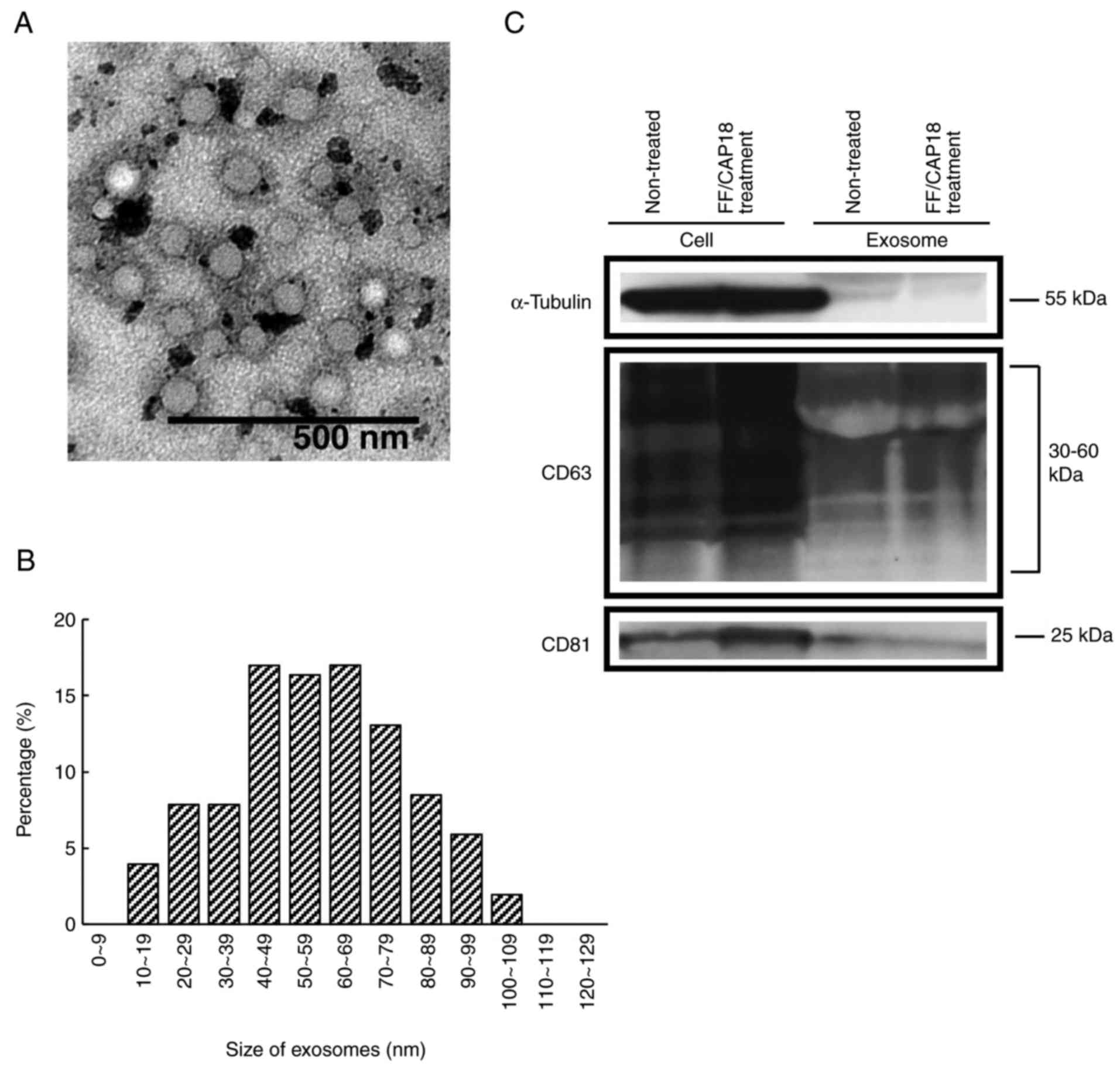 To ensure successful isolation of exosomes, the collected exosomes from non-treated HCT116 cells were observed as microvesicle clusters (Fig. 1A). For size distribution, 78% of exosomes were 40-100 nm (Fig. 1B). The amount of exosomes was 3.8×10−8 and 4.9×10−8 mg/cell in untreated controls and FF/CAP18-treated cells, respectively.