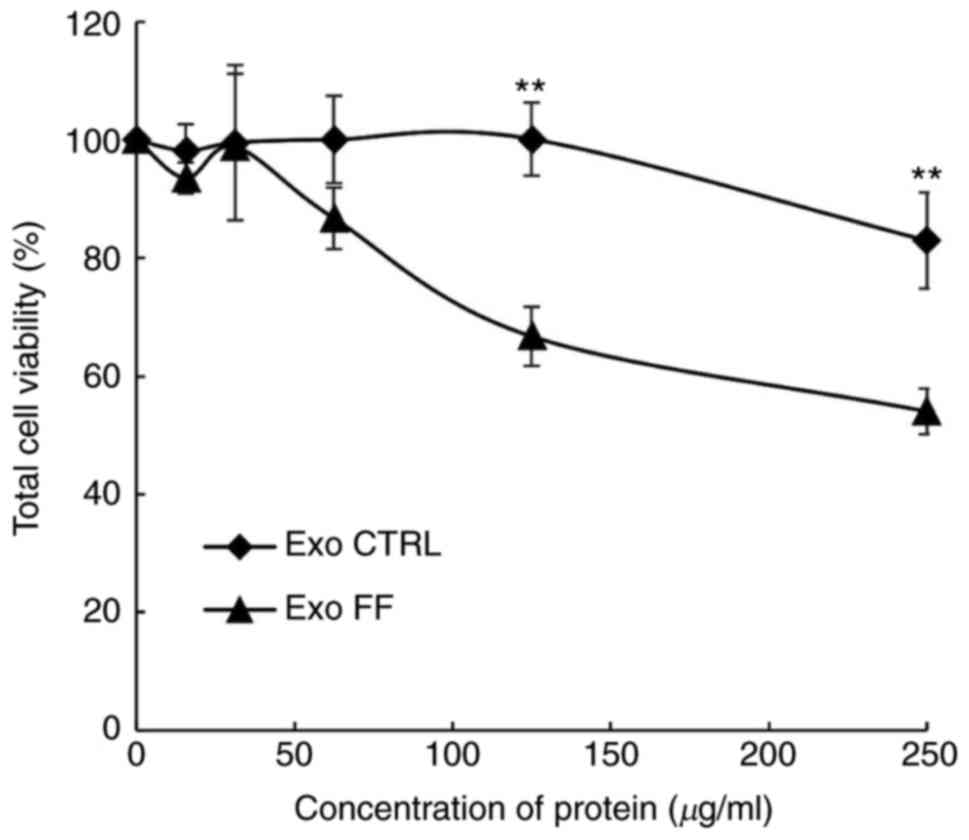 Exosomes were quantified with the DC protein assay to evaluate the effect of FF/CAP18 on the exosome secretion volume. The amount of pooled exosomes released from cells during FF/CAP18 exposure was 5.0×10-8 mg/cell. The amount of exosomes released from non-treated control cells was 3.8×10−8 mg per cell. To determine whether exosomes affect the viability of HCT116 cells, exosomes released from control HCT116 cells (Exo CTRL) and from cells treated with FF/CAP18 (Exo FF) were harvested and added to HCT116 cells in the WST-8 assay. The effect on cell viability was evaluated at exosome protein concentrations of 15.63, 31.25, 62.5, 125 and 250 µg/ml. The cell viability (Exo FF group) was significantly decreased at 125 and 250 µg/ml (Fig. 3, P<0.01). The effect of Exo CTRL was less prominent compared with that of Exo FF.