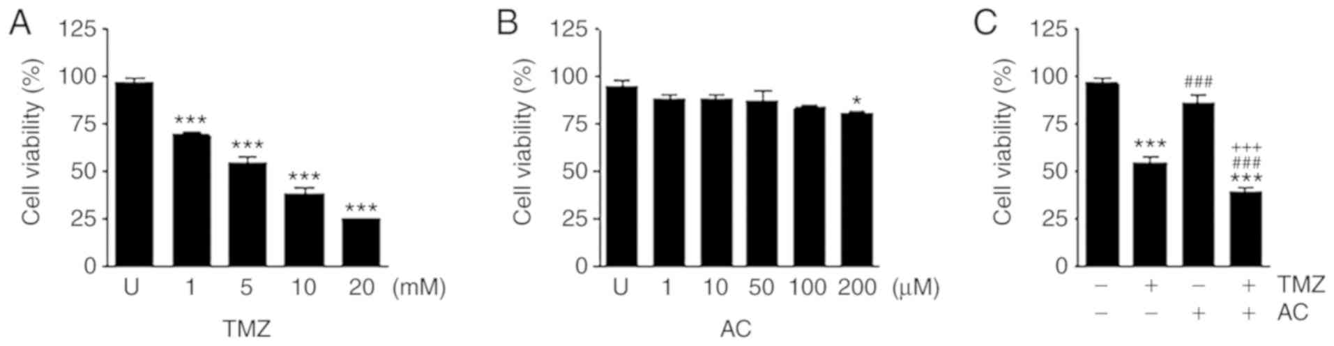 Therefore, evidence suggests that both acteoside and TMZ induce anticancer effects through cell death. However, their association and anticancer effects in the context of glioblastoma remain to be elucidated. Therefore, the objective of the present study was to verify the synergistic anticancer effects of acteoside combined with TMZ in glioblastoma therapy. A cell viability assay was performed to analyze the anticancer effects of the combination treatment in C6 glioblastoma cells (a rat glioblastoma cell line), and the results were compared with those following treatment with TMZ alone. To further examine the mechanism of cell death caused by cotreatment with acteoside and TMZ, apoptosis- and autophagy-related genes in C6 cells were examined.