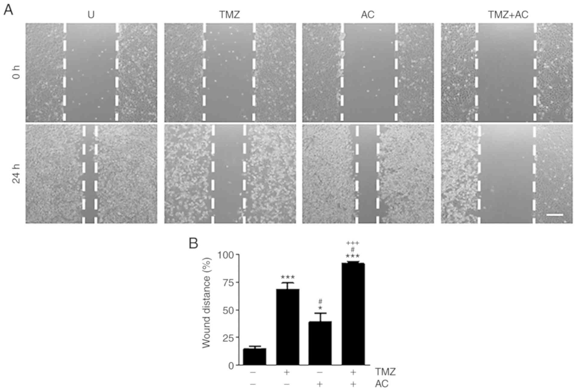 A C6 cell suspension in 1 ml was cultured in a 12-well plate and grown to confluence. The cells were treated with TMZ, acteoside or TMZ + acteoside and then scratched with a sterile 10-µl pipette tip to create an artificial wound. At 0 and 24 h post-wounding, digital images of the wound healing process were captured using an inverted microscope. Cell migration was quantified by measuring the size of the scar at 0 and 24 h using the image analyzing software, ImageJ 1.43u/Java1.6.0_22 software (NIH, Bethesda, Maryland, USA). Each experiment was performed three times and the measurements were performed in triplicate.