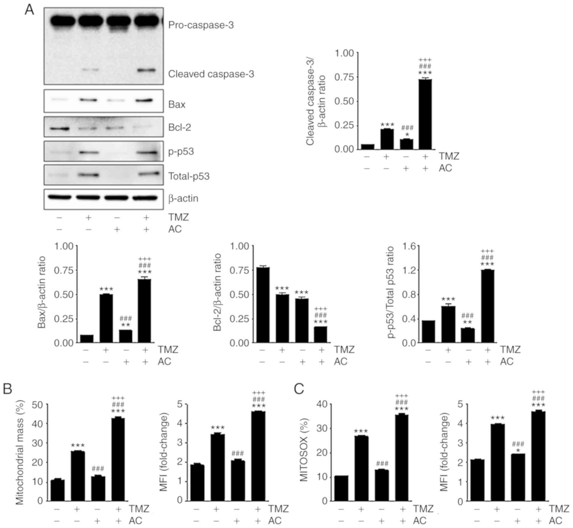 The results of the western blot analysis revealed that the levels of cleaved caspase-3, Bax and phosphorylated p53 were higher and the levels of Bcl-2 were lower following combination treatment with TMZ and acteoside than following treatment with TMZ alone (Fig. 4A). Acteoside-mediated mitochondrial function and the generation of reactive oxygen species (ROS), which are key mediators of apoptotic signaling, were then observed in the TMZ-treated C6 cells. To verify mitochondrial mass, fluorescence-activated cell sorting analysis was performed using MitoTracker Green. Cotreatment with TMZ and acteoside resulted in a higher mitochondrial mass than treatment with TMZ alone (Fig. 4B). ROS generation was significantly higher following cotreatment with TMZ and acteoside than treatment with TMZ alone (Fig. 4C). These results suggest that ROS generation and mitochondrial function are important in apoptosis induced by treatment with TMZ + acteoside.