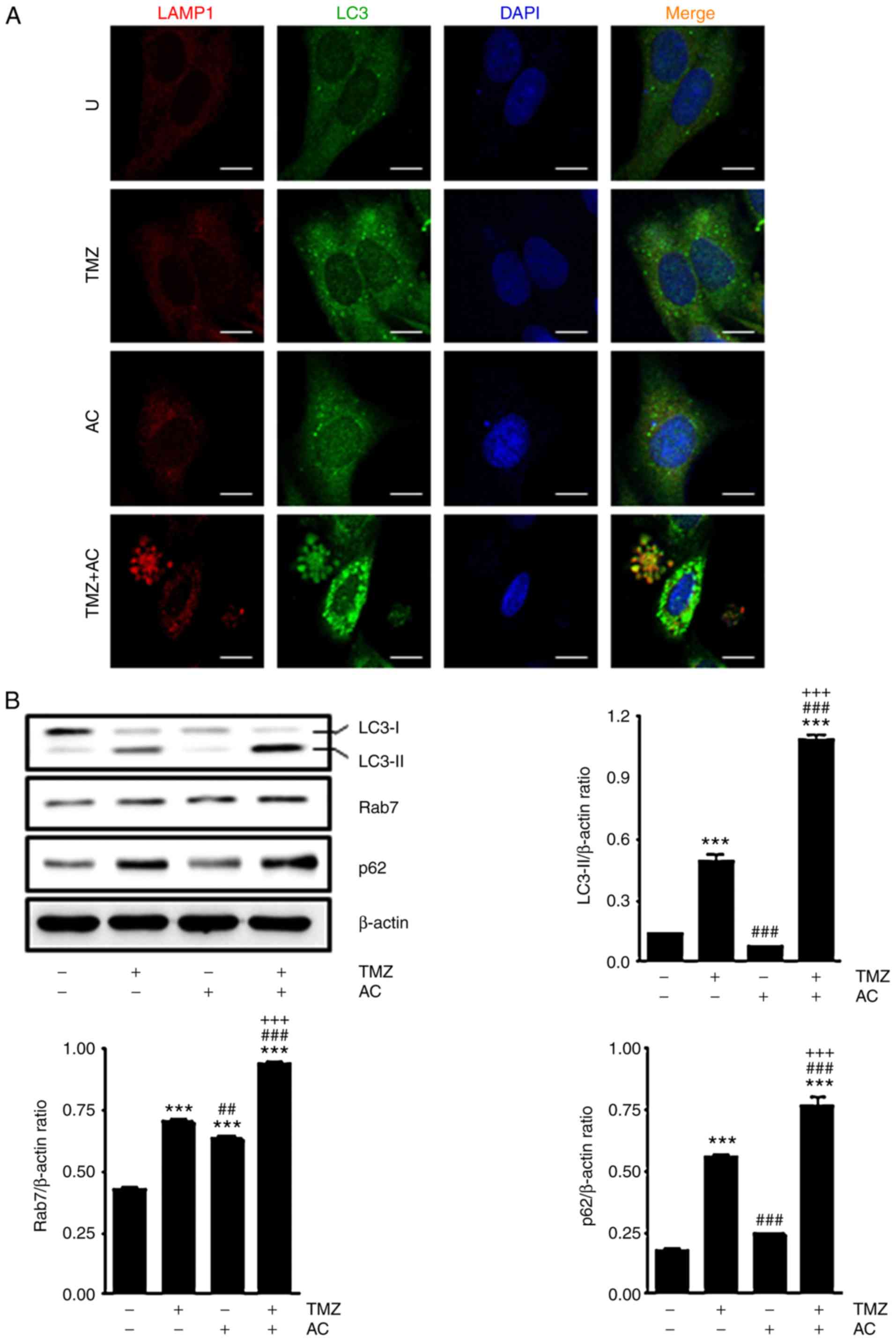 TMZ has been reported to induce autophagy (28,29); therefore, the present study examined the extent to which autophagy was induced by TMZ + acteoside treatment. The C6 cells were treated with TMZ with or without acteoside; after 24 h, and the cells were stained for immunofluorescence to detect LAMP1 and LC3 as markers of autophagy. Higher expression levels of LAMP1 and LC3 were observed following the combination treatment (Fig. 5A). Autophagy-related protein expression was also examined, and it was found that TMZ induced the conversion of LC3-I to LC3-II, which is a signature of autophagosome generation. A higher rate of conversion of LC3-I to LC3-II was observed following cotreatment with TMZ and acteoside than treatment with TMZ alone. The expression levels of Rab7 and p62 indicated autophagy induction in the TMZ-treated cells (Fig. 5B). These findings suggest that cotreatment with TMZ and acteoside enhanced the autophagic process in glioblastoma cells.