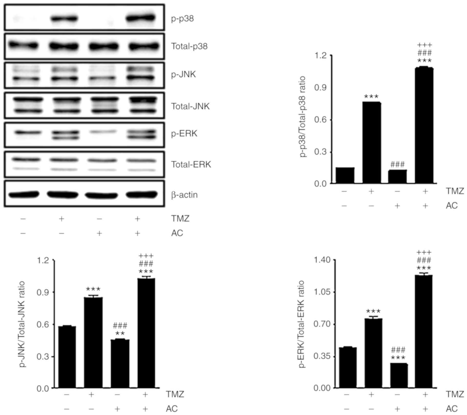 Previous studies have demonstrated that TMZ regulates the MAPK pathway, including p38, JNK and ERK (30). Therefore, the present study investigated whether acteoside affects TMZ-related MAPK gene expression. The C6 cells were treated with TMZ with or without acteoside. After 24 h, TMZ treatment resulted in higher expression levels of p-p38, p-JNK and p-ERK. The expression of TMZ-regulated genes was significantly higher following TMZ + acteoside treatment than treatment with TMZ alone (Fig. 6). These observations suggest that acteoside affects TMZ-based therapeutic mechanisms via the MAPK pathway.