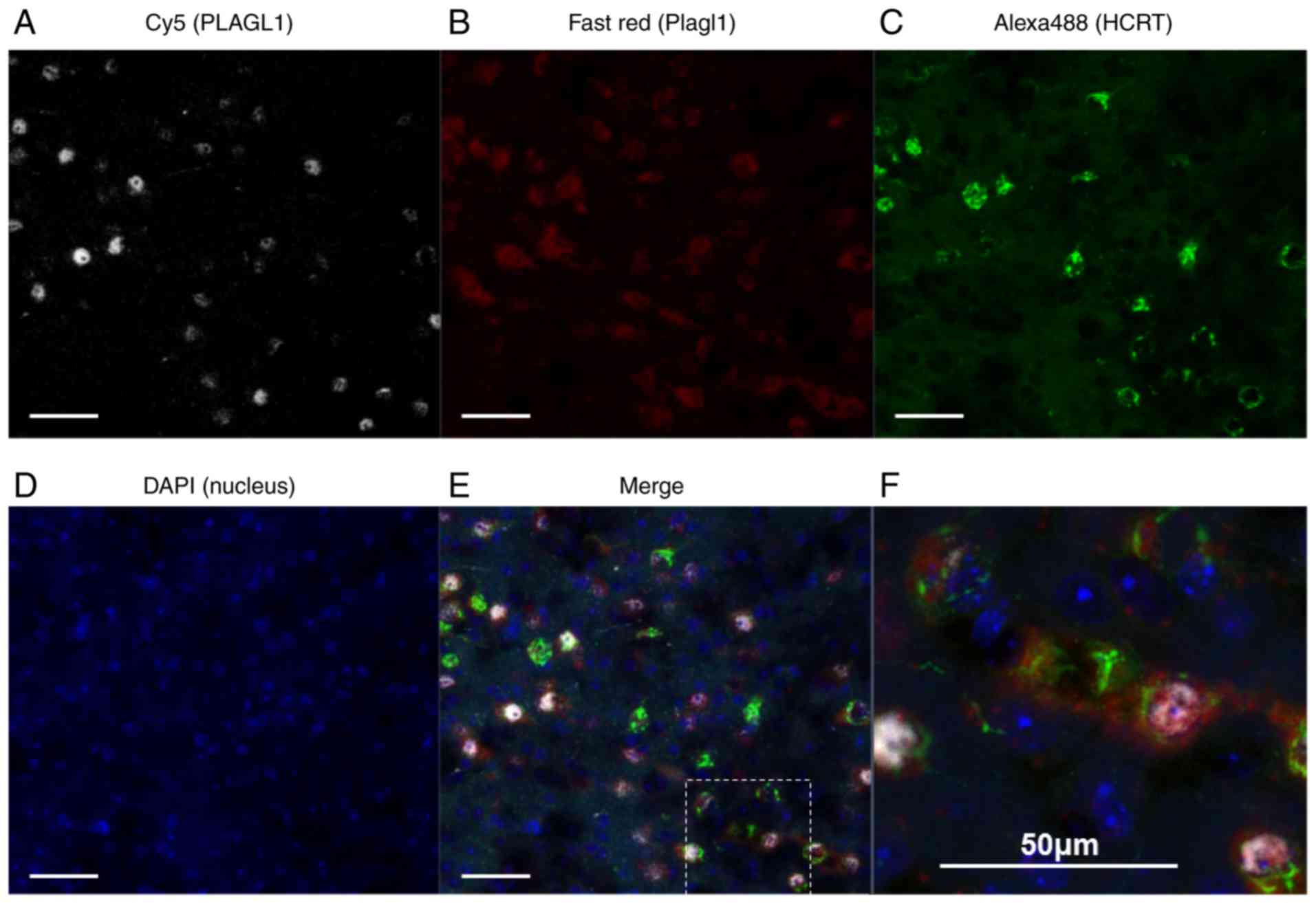Mice were deeply anesthetized with pentobarbital (50 mg/kg, i.p.), and transcardially perfused with PBS, followed by 4% formaldehyde in 0.1 M phosphate buffer (pH 7.4). The whole brains were removed, immersed in 4% formaldehyde in 0.1 M phosphate buffer (pH 7.4) for 12 h at 4°C, cryoprotected in 20% sucrose in 0.1 M phosphate buffer (pH 7.4) for 6 h at 4°C, and cryosectioned into 25-µm coronal sections. Sections were stored in PBS/0.3% Triton X-100 (PBST) with 60% glycerol at −20°C until use. The free-floating sections were blocked with PBST/5% bovine serum albumin (BSA; cat. no. A-4503; Sigma-Aldrich; Merck KGaA) at room temperature for 2 h and incubated overnight at 4°C with a rabbit anti-hypocretin-1 antibody (1:5,000; cat. no. H-003-30; Phoenix Pharmaceuticals, Inc., Burlingame, CA, USA) and mouse anti-PLAGL1 antibody [1:1,000; ZAC1 antibody (C-7)] in PBST/5% BSA. The next day, sections were incubated with a donkey Cy5-labeled anti-mouse immunoglobulin (Ig)G (1:500; cat. no. 715-175-150, Jackson ImmunoResearch Laboratories, Inc., West Grove, PA, USA) and a goat Alexa Fluor® 488-labeled anti-rabbit IgG (1:3,000; cat. no. A-11008, Molecular Probes; Thermo Fisher Scientific, Inc., Waltham, MA, USA) for 30 min at room temperature. After washing with PBST, the stained sections were mounted on Superfrost Plus slides (Thermo Fisher Scientific, Inc.) and air-dried. Once washed with distilled water, slides were baked at 60°C for 30 min. Subsequently, in situ hybridization was conducted with the RNAscope® 2.5 HD Reagent kit-RED (cat. no. 322350; Advanced Cell Diagnostics, Inc., Newark, CA, USA), and probe Mm-Plagl1 (cat. no. 462941; Advanced Cell Diagnostics, Inc.), positive control probe Mm-RNA polymerase II subunit A (cat. no. 312471; Advanced Cell Diagnostics, Inc.) or negative control probe DapB (cat. no. 310043; Advanced Cell Diagnostics, Inc.), according to the manufacturer's protocols. After final amplification, Fast Red chromogenic detection was performed. The slides were coverslipped with DAPI Fluoromount-G (cat. no. 0100-20; Southern Biotech, Birmingham, AL, USA), and the resulting hypocretin, PLAGL1 protein and Plagl1 mRNA signals were visualized using confocal laser microscopy (LMS700; Zeiss GmbH, Jena, Germany). Bright-field images of Fast Red staining were captured using the Eclipse E-1000M (Nikon Corporation, Tokyo, Japan) with a digital camera.