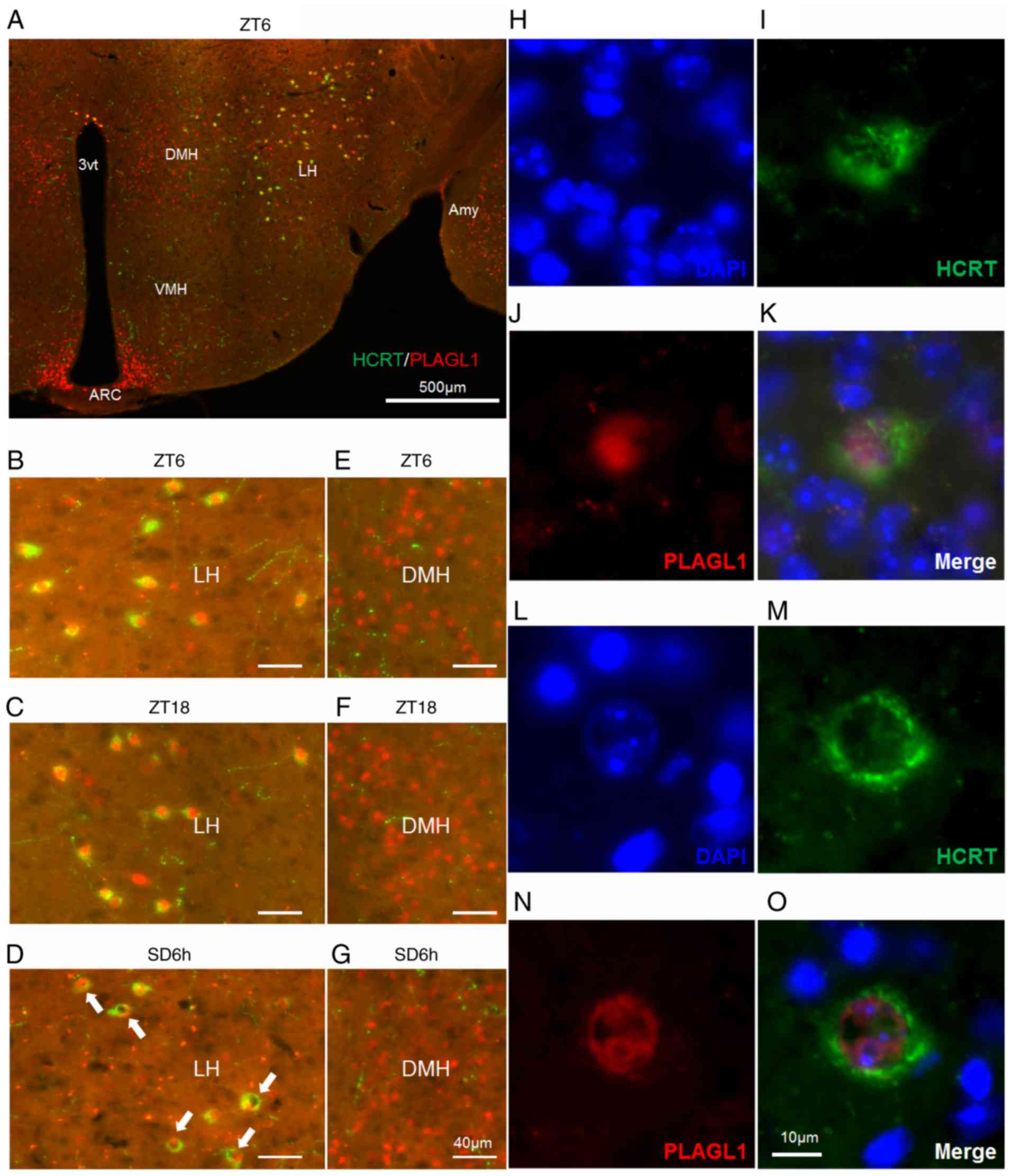 PLAGL1 is expressed in the lateral hypothalamic area, dorsomedial hypothalamic nucleus and arcuate nucleus of the adult male mouse hypothalamus at ZT6 (Fig. 2A) and is localized within hypocretin neurons (Fig. 2A and B). A relatively specific and uneven nuclear localization of PLAGL1 was detected in the hypocretin neurons of the lateral hypothalamic area in mice with SD6h (Fig. 2D, arrows) compared with ZT6 (Fig. 2B) and ZT18 (Fig. 2C) in the dorsomedial hypothalamic nucleus at ZT6, ZT18 and SD6h (Fig. 2E-G), or the arcuate nucleus (data not shown). Subsequently, DAPI staining revealed diffuse nuclear staining of PLAGL1 at ZT6 (Fig. 2B and H-K) and a heterochromatin-like structure in the hypocretin neurons with SD6h. The uneven nuclear localization of PLAGL1 was not merged with the heterochromatin-like structure (Fig. 2L-O), suggesting that PLAGL1 was specifically related to the euchromatin structure and transcription in hypocretin neurons following SD6h. Furthermore, a significant increase was noted in the number and frequency of PLAGL1-positive hypocretin neurons at ZT18 compared with the control group (ZT6) (Fig. 3).