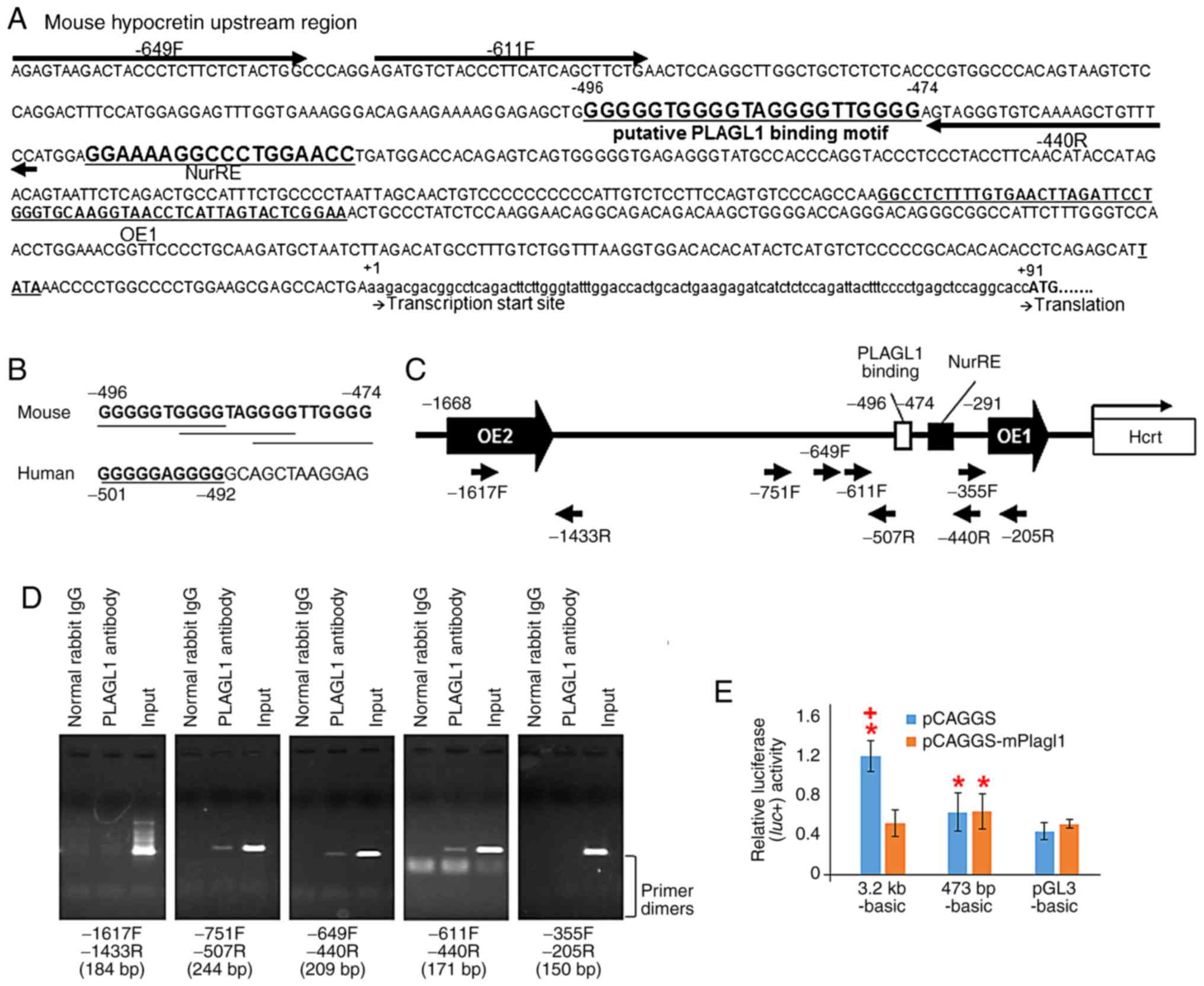 The present study aimed to examine the involvement of these downregulated transcription factors (12) in hypo-cretin transcription. This study further identified PLAGL1 as a co-expressed transcription factor in hypothalamic hypocretin neurons. PLAGL1 has seven zinc fingers of the C2H2 class (15), recognizes DNA and RNA, and possesses transcriptional activity (16). In humans, PLAGL1 undergoes parental genomic imprinting and is paternally expressed (17). Plagl1-null mice exhibit intrauterine growth restriction, altered bone formation and neonatal lethality (18); therefore, null mouse lines are difficult to obtain. In the present study, the functional relevance of PLAGL1 in hypocretin transcription was investigated and the results revealed that PLAGL1 may be associated with the canonical development and modulation of various physiological processes in hypocretin neurons via newly identified PLAGL1 binding sites (G4N2G4) (19) within the hypocretin upstream promoter region.