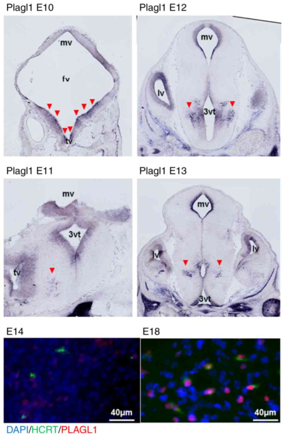 In the present Plagl1 overexpression model using in utero electroporation, it was revealed that PLAGL1 may induce hypocretin expression, specifically in the hypothalamus. The majority of EGFP signals co-localized with hypocretin were detected in the cerebral parenchyma at a distance from the vicinity of the third ventricle, suggesting that some progenitor cells of the third ventricular zone need to migrate to the designated area from the ependymal layer of the third ventricle. The differentiation of these cells might also be affected by the gradient of some factors, including the hypothalamic patterning factor sonic hedgehog (9), the adult hypocretin neurogenesis inducer fibroblast growth factor 2 (51), generators of hypocretin neurons (47,48), or other unidentified factors at the time of migration or arrival at the designated area.