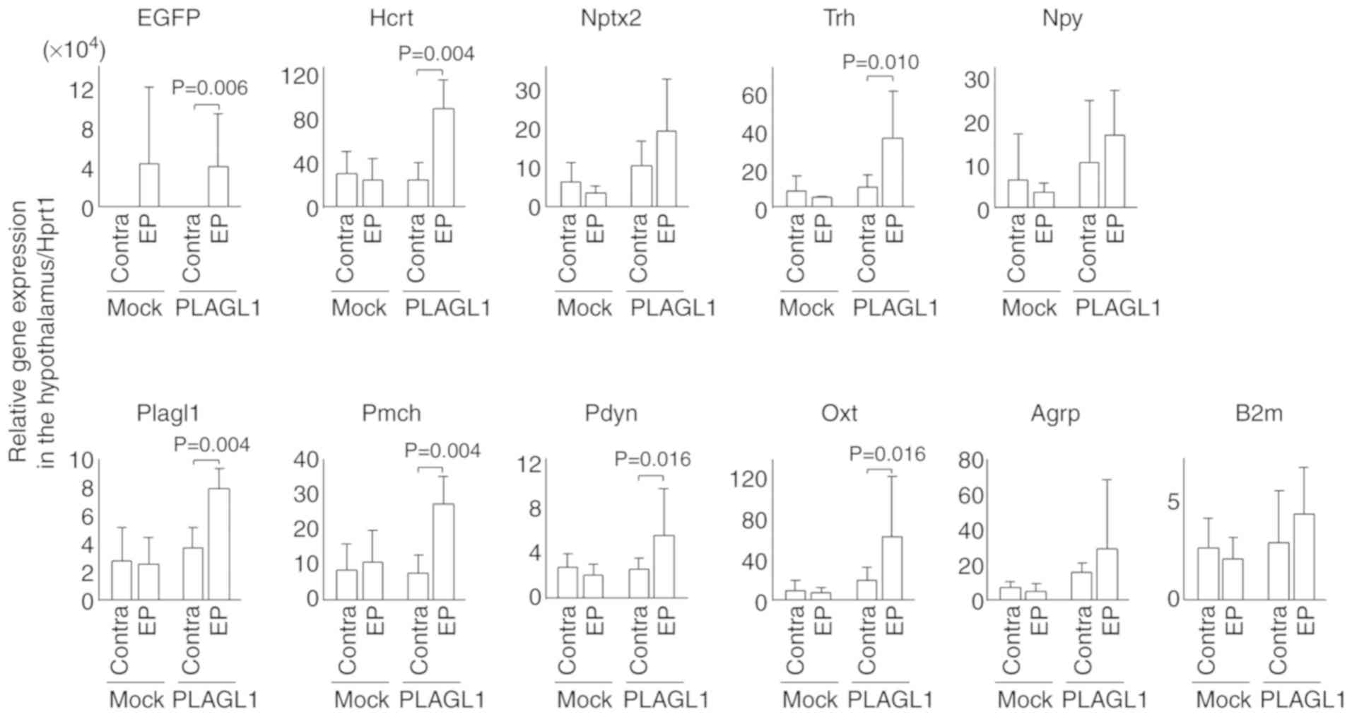 In order to avoid false positives associated with background signals in immunohistochemical staining, qPCR was performed to confirm the transcriptional effects of PLAGL1 on hypocretin. The EGFP expression levels were elevated on the electroporated side as compared with the contralateral side (contralateral side: mean ± standard deviation, 1,383.9±1,978.6 in the mock group, 723.4±1,057.6 in the PLAGL1 group; electroporated side: 42,006.1±75,966.2 in the mock group, 38,586.3±53,484.7 in the PLAGL1 group) in both the mock and PLAGL1 groups (Fig. 6). There was no significant difference in Plagl1 expression between the contralateral side (2.8±2.4) and the electroporated side (2.6±1.8) in the mock group, but there was a significant difference in Plagl1 expression (P<0.005) between the contralateral side (3.7±1.4) and electroporated side (7.9±1.5) in the PLAGL1 group. There was no significant difference in hypocretin expression between the contralateral side (27.6±20.1) and electroporated side (22.7±18.6) in the mock group, but there was a significant difference (P<0.01) in hypocretin expression between the contralateral side (21.9±15.3) and electroporated side (83.5±25.9) in the PLAGL1 group. Therefore, these data suggested that PLAGL1 may upregulate hypocretin transcription. PLAGL1 slightly affected neuronal pentaxin 2 transcription and significantly affected prodynorphin transcription. These two genes are concurrently expressed in hypocretin neurons (27,28). There was no effect of PLAGL1 on the housekeeping gene, B2m.