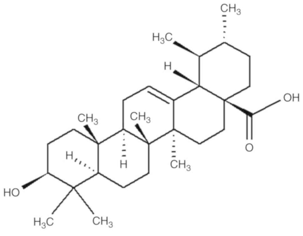 Ursolic acid (UA; Fig. 1), a pentacyclic triterpenoid found in holy basil and apple peels (19), has various pharmacological properties, such as antioxidant, anti-inflammatory and anticancer (20,21). Recently, Gan et al (22) reported that UA ameliorates CCl4-induced liver fibrosis. However, the regulatory effect of UA on TSLP production by mast cells has not been fully elucidated. The aim of the present study was to investigate the effects of UA on the HMC-1 human mast cell line and determine whether UA can regulate TSLP production in mast cells.