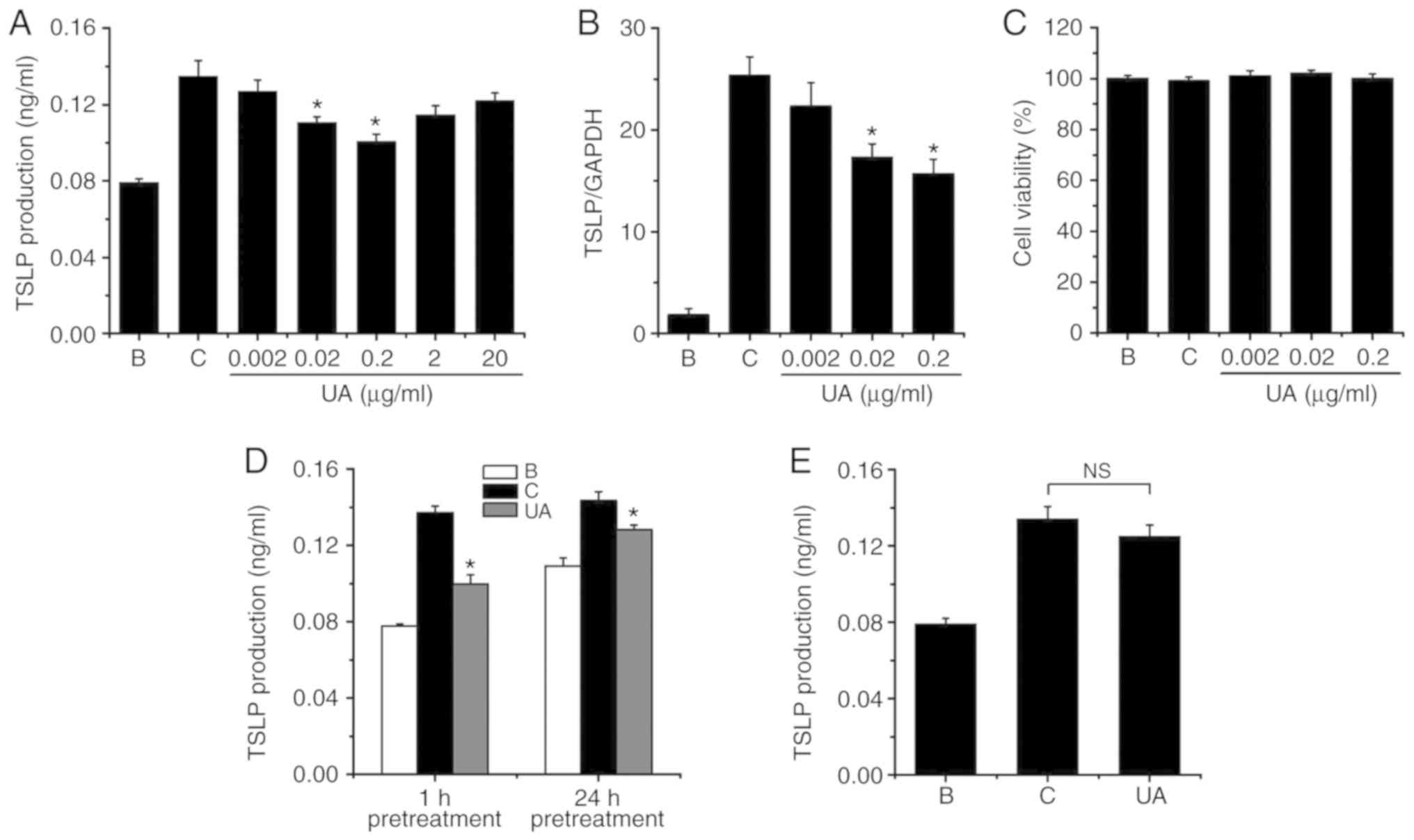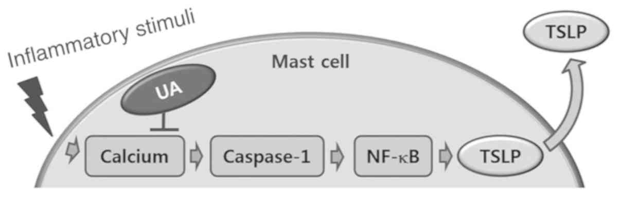 In the present study, UA was shown to suppress the production and mRNA expression of TSLP in HMC-1 cells. In addition, UA reduced NF-κB activation, IκBα degradation and caspase-1 activity in HMC-1 cells. Finally, it was demonstrated that UA downregulated intracellular calcium levels in HMC-1 cells.