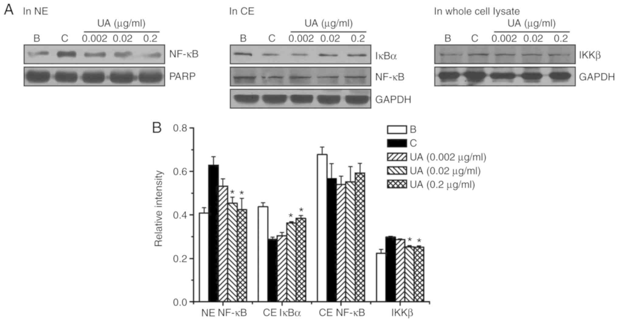 HMC-1 cells (5×106) were pretreated with UA (0.002-0.2 μg/ml) for 1 h prior to PMACI stimulation. Proteins of obtained lysates were separated and transferred to nitrocellulose paper, as described previously (28). In brief, the cell lysates were prepared in a sample buffer containing sodium dodecyl sulfate (SDS). The samples were heated at 95°C for 5 min and briefly cooled on ice. Following centrifugation at 15,000 × g for 5 min, the proteins in the cell lysates were separated by 10% SDS-polyacrylamide gel electrophoresis and transferred to nitrocellulose paper. The membrane was blocked with 5% skimmed milk in PBS-Tween-20 for 1 h at room temperature and then incubated with primary antibodies (1:500 dilution for all primary antibodies; NF-κB; cat. no. sc-8008; IκBα; cat. no. sc-847; IKKβ; cat. no. sc-7607; PARP; sc-8007; GAPDH; cat. no. sc-32233; all purchased from Santa Cruz Biotechnology, Inc.) overnight at 4°C and secondary (mouse anti-rabbit IgG-HRP; 1:5,000; cat. no. sc-2357; goat anti-mouse IgG-HRP, 1:5,000; cat. no. sc-2005; all purchased from Santa Cruz Biotechnology, Inc.) antibodies for 1 h at room temperature. Finally, the protein bands were visualized by an enhanced chemiluminesence solution (Amersham; GE Healthcare) following the manufacturer's instructions. All protein expression levels were quantitated using ImageJ software (National Institutes of Health).