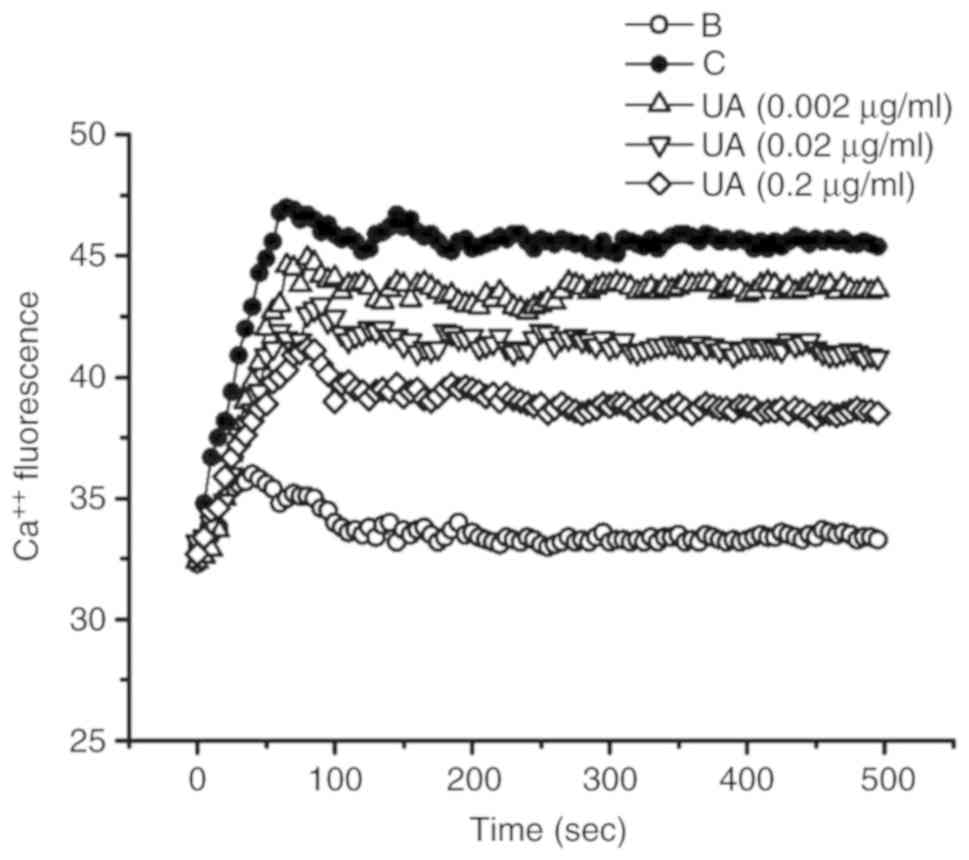 HMC-1 cells (1×105) were pretreated with Fura-2/AM for 30 min. After washing twice with medium containing the extracellular calcium chelator EGTA (0.5 mM), the cell suspension (1×105) was seeded into a 96-well plate and pretreated with UA (0.002-0.2 μg/ml) for 20 min. Next, the cells were stimulated with PMACI for 5 min. Plate fluorescence was measured at 440 nm (excitation, 360 nm) in a spectrofluorometer (29).