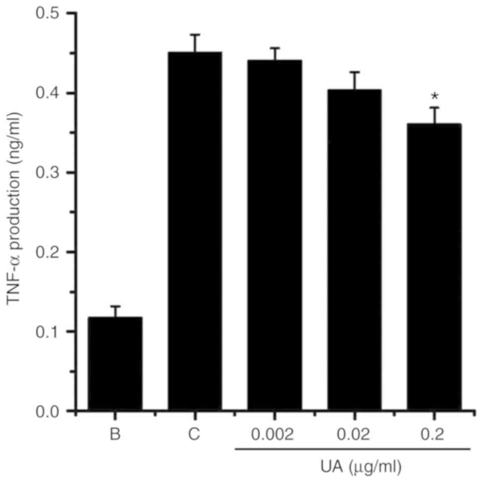 HMC-1 cells (3×105) were pretreated with UA (0.002-0.2 μg/ml) for 1 h prior to stimulation with 0.05 μM PMA plus 1 μM calcium ionophore (PMACI), and then incubated for 7 h. TSLP and TNF-α levels were assessed in the culture supernatants using ELISA, as described previously (24).
