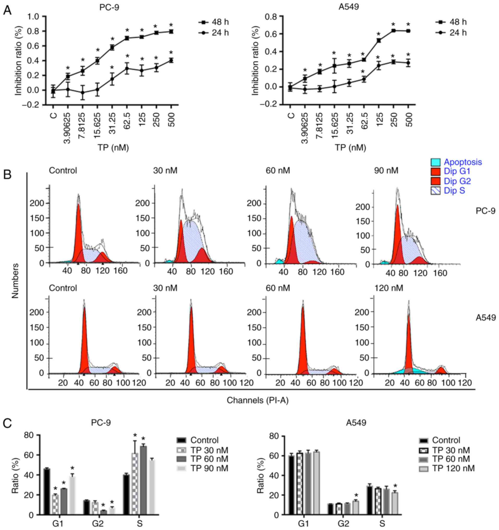 Whether TP influences cell viability by affecting the cell cycle was examined (Fig. 1B). On the basis of the inhibition ratio, two concentrations within the sharp-slope region (30 and 60 nM) and one concentration in the plateau region (90 nM, PC-9; 120 nM, A549) were selected. As shown in Fig. 1C, TP at the concentration in the sharp-slope region (30 and 60 nM) strongly promoted the G1/S arrest in PC9 cells. There was a slight increase in the number of cells in the S phase at 90 nM TP as well, but the change was not statistically significant. Similar results were not seen in corresponding experiments on A549 cells after treatment with TP for 24 h. A slight decrease in the number of cells in the S phase at 120 nM TP was observed, though it appeared that TP in general did not affect the cell cycle in A549 cells (Fig. 1C).