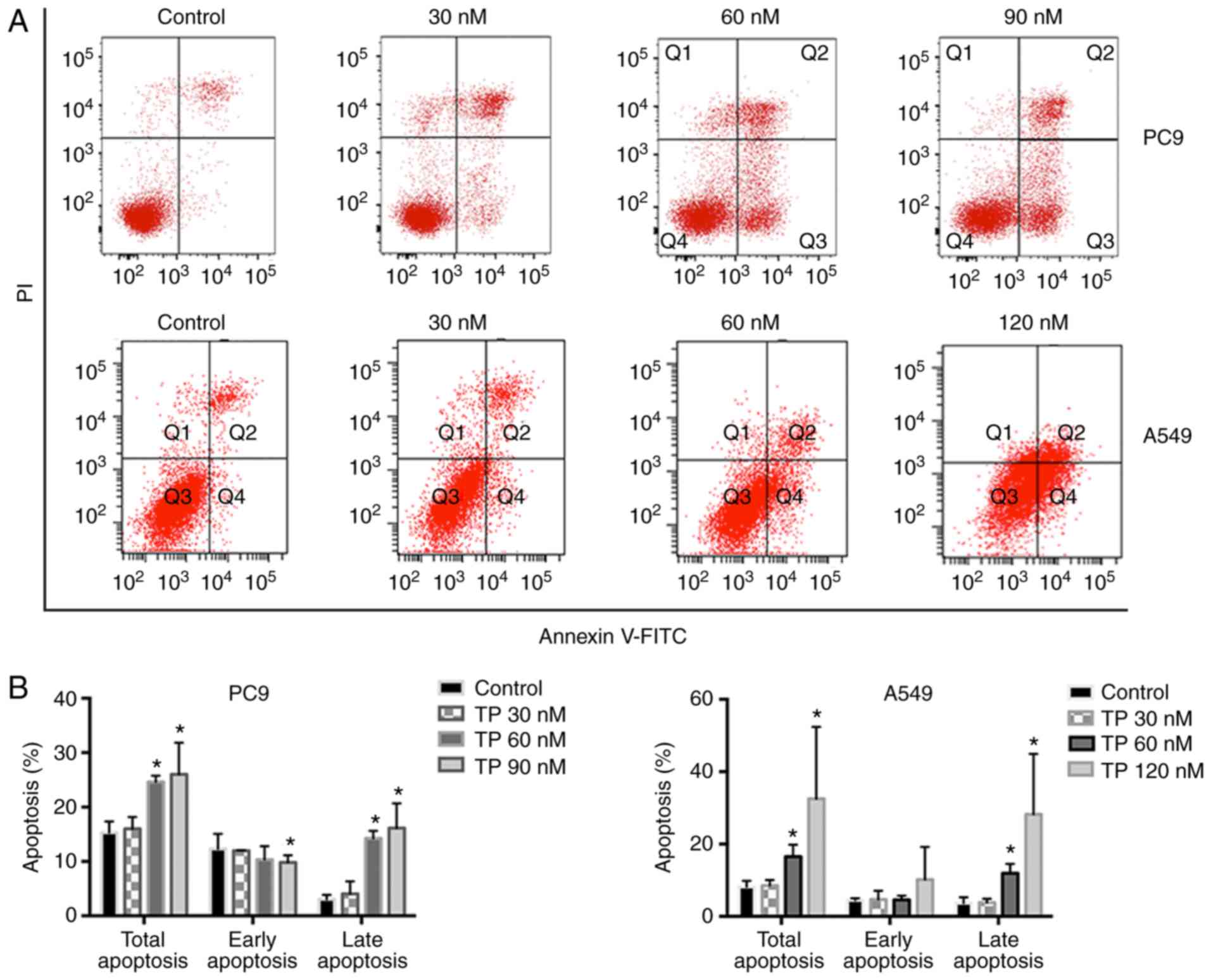 At 3×105 cells per well were exposed to TP in 12 wells for 24 h after overnight serum starvation. Thereafter, the cells were washed with PBS and fixed with 70% ethanol at 4°C overnight. Then, cell cycle analyses were performed through flow cytometry according to the manufacturer's instructions (Beyotime Institute of Biotechnology). Apoptosis was analyzed via pre-treatment with a selected concentration of TP for 24 h (PC9 cells) or 48 h (A549 cells) and then was detected with the Annexin V/PI Staining kit (Nanjing KeyGen Biotech Co., Ltd.) and assayed by flow cytometry (BD FACS Calibur; BD Biosciences). Cells undergoing early-stage apoptosis were categorized as Annexin V+/PI−, whereas Annexin V+/PI+ cells were assumed to be at a late stage of apoptosis. Subsequently, mitochondrial trans-membrane potential ΔΨ) was determined according to the manufacturer's instructions using the JC-1 Apoptosis Detection kit (Beyotime Institute of Biotechnology). Data analysis was conducted using the FlowJo software (oxs 10.6; FlowJo LLC).