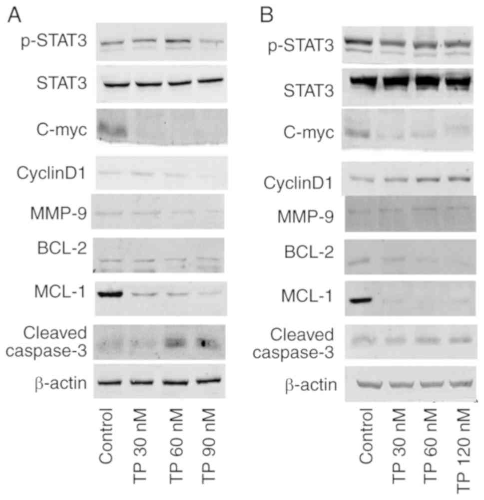 Expression levels of target genes of STAT3 were also examined. C-myc expression was found to greatly decreased upon TP treatment in PC9 (Fig. 4A) and A549 cells (Fig. 4B). Although cyclin D1 was downregulated by TP in PC9 cells (Fig. 4B), cyclin D1 was upregulated by TP treatment in A549 cells (Fig. 4B). The overexpression of cyclin D1 may contribute to resistance to TP (25), as well as cell DNA damage (24). Caspase-3 is a critical executioner of apoptosis, as it is either partially or totally responsible for the proteolytic cleavage of many key proteins, and cleaved caspase-3 is the active form of the protein. As shown in PC9 cells (Fig. 4A), TP increased the level of cleaved caspase-3. Expression of anti-apoptotic proteins MCL-1 and BCL-2 was decreased after TP treatment in a dose-dependent manner in PC9 (Fig. 4A) and A549 cells (Fig. 4B). The two bands of BCL-2 seen in Fig. 4A may be homedimers or poor antibody specificity (26). TP also downregulated MMP-9 expression in a dose-dependent manner in PC9 (Fig. 4A) and A549 cells (Fig. 4B). The above results suggested that TP treatment inhibited cell proliferation, induced apoptosis and inhibited cell migration by suppressing the activation of STAT3.