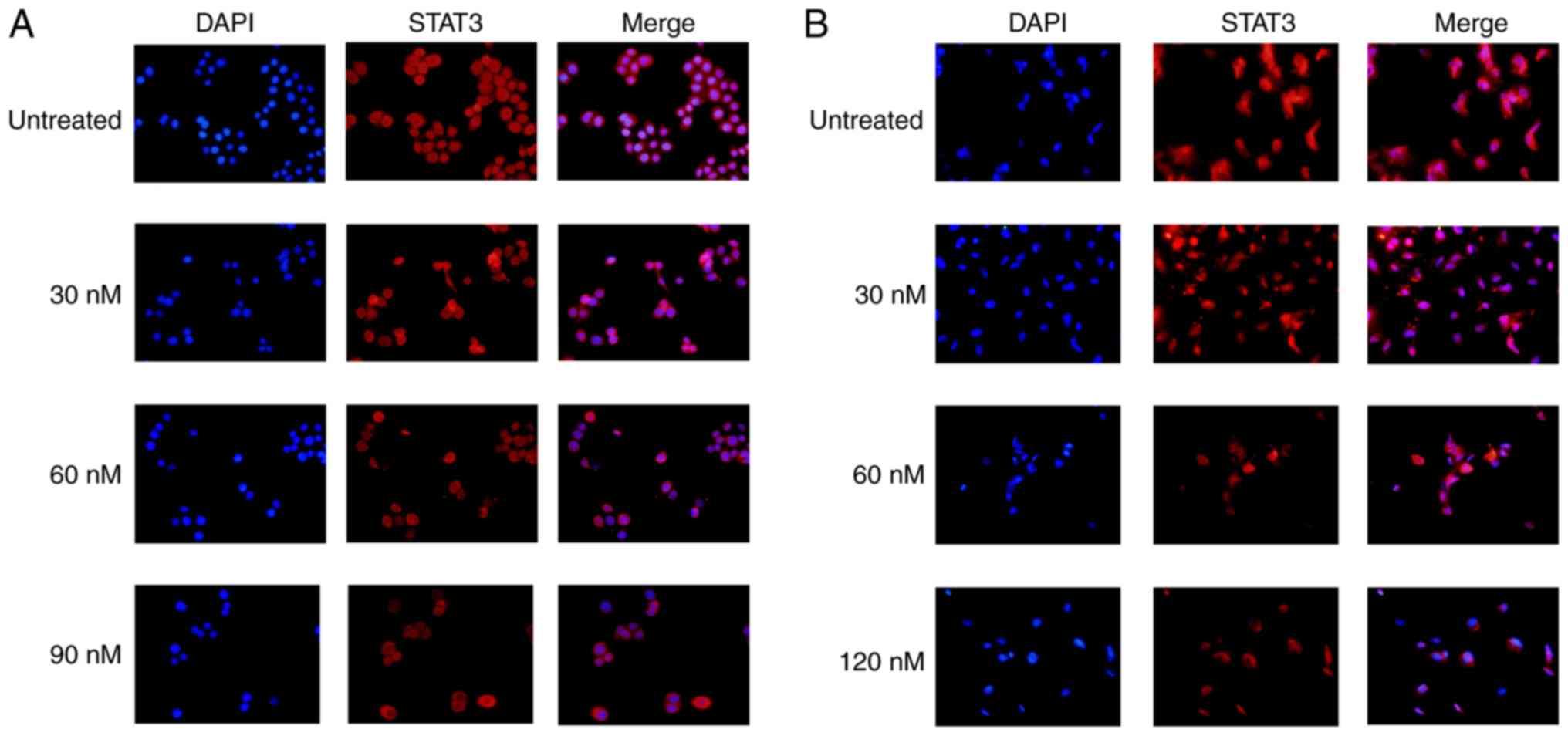 Cells (105 cells/well) were seeded on glass cover slides. After treatment with 60 nM TP or 4 μM STAT3 inhibitor for 24 h, the cells were fixed with 4% buffered formalin for 30 min at room temperature, permeabilized with 0.5% Triton X-100, and blocked with 10% goat serum in PBS (Servicebio) for 30 min at room temperature. After successive incubation with the primary antibody (1:100) at 4°C for 12 h, a secondary antibody (DyLight 488-conjugated goat anti-rabbit IgG; 1:8,000) was incubated for another 1 h at room temperature, at last cells were stained with DAPI (1:500) in the dark for 5 min. The fluorescence signals were captured using a fluorescence microscope (Nikon Eclipse CI; Nikon Corporation).