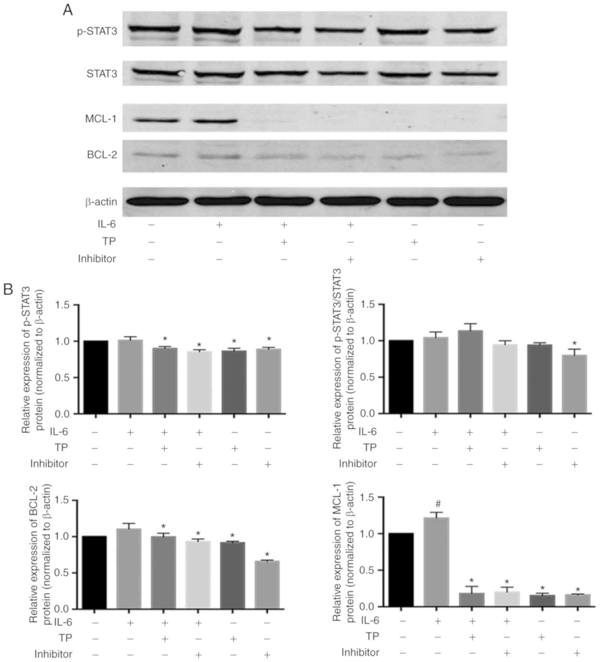 TP (>98% purity) was purchased from Dalian Meilun Co., Ltd. Human recombinant IL-6 (cat. no. 200-06; Peprotech, Inc.) was resolved and stored according to the manufacturer's instructions. 3-(4,5-Dimethylthiazol-2-yl)-2, 5-diphenyltetrazolium bromide (MTT) and protease inhibitor cocktail (cat. no. 04693132001) were purchased from Sigma-Aldrich (Merck KGaA). Antibodies against anti-cleaved caspase-3 (cat. no. GB11009) were purchased from Servicebio. Antibodies against BCL-2 (cat. no. 182858) and MMP-9 (cat. no. 76003) were purchased from Abcam, MCL-1 (cat. no. 94296), cyclin D1 (cat. no. 2978S), C-myc (cat. no. 5605S), STAT3 (cat. no. 4904) and p-STAT3 (cat. no. 9145) were acquired from Cell Signaling Technology Inc., and antibodies against β-actin (cat. no. BB0710) were from Biossci Biotechnology Co., Ltd. DAPI, Triton X-100 and an anti-fade mounting medium were purchased from Servicebio. The Annexin V/PI Apoptosis Detection kit (cat. no. KGA105-KGA108) was from Nanjing KeyGen Biotech Co., Ltd. Propidium iodide (PI) and the JC-1 Staining kit were acquired from Beyotime Institute of Biotechnology. DyLight 488-conjugated goat anti-rabbit IgG antibody (cat. no. A24221) was from Abbkine Scientific Co., Ltd.