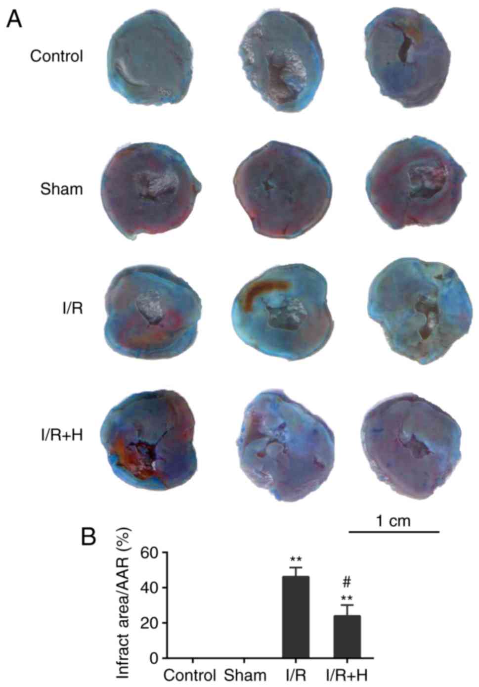 Myocardial ischemia and reperfusion (I/R) injury is a primary risk factor for causing myocardial infarctions (MI), which is the most common cause of mortality in developed countries (1-3). It has been estimated that ~15.9 million individuals worldwide suffered from MI in 2015 (4). Although reperfusion therapy has been demonstrated to be able to restore impaired cardiac function and to mitigate the infarct size following ischemic events, the additional tissue injury caused by reperfusion is almost inevitable (5).