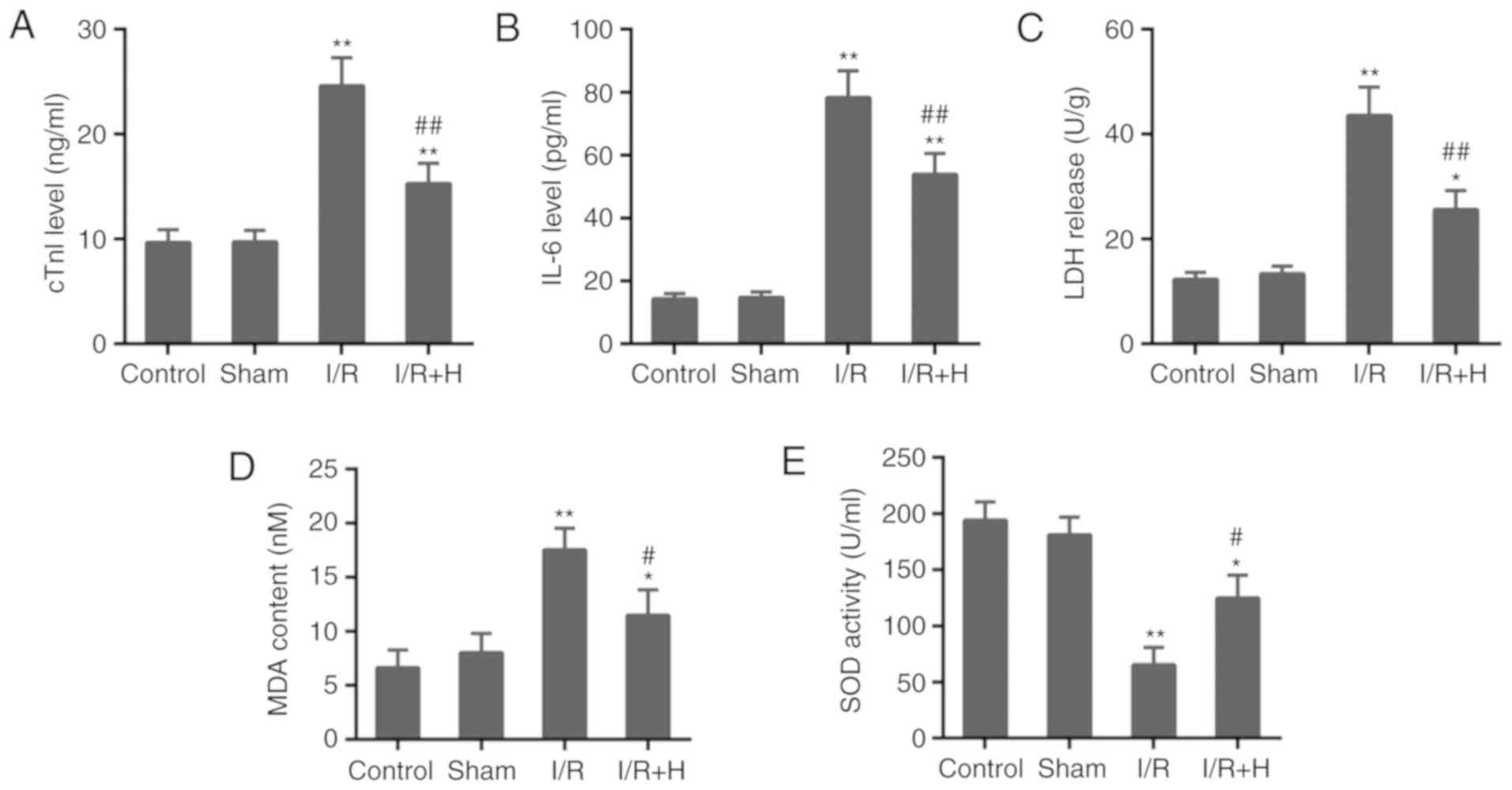 Following reperfusion, blood samples in rats and cells in the culture medium were harvested. The blood and cells were then centrifuged at 3,000 × g for 15 min at room temperature to obtain sera and cell supernatant. The levels of cTnI, IL-6 and LDH release were examined to estimate myocardial damage. The levels were measured using commercially available ELISA kits according to the manufacturer's protocol. The absorbance was read on a microplate reader (Thermo Fisher Scientific, Inc.). The serum and the cell culture supernatant were also used to estimate oxidative stress markers, including the content of MDA and the activity of SOD, which were detected with commercial assay kits using fluorescence spectrophotometry (F-7100; Hitachi, Ltd., Tokyo, Japan) following the manufacturer's protocols.
