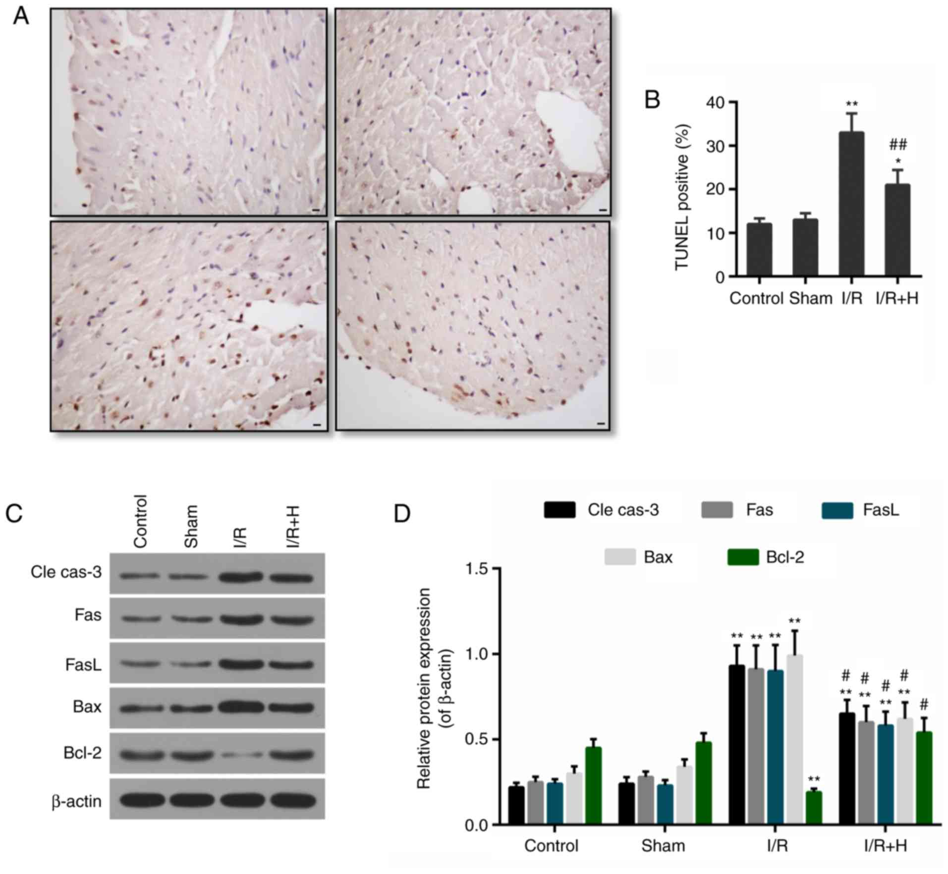Multiple mechanisms are hypothesized to be involved in I/R injury (1). The inflammatory response to I/R is common in myocardial I/R injury (6). Various cytokines will be released during the inflammation reactions (7). Reactive oxygen species (ROS) generation also occurs in the myocardium; however, if ROS cannot be cleared promptly, intracellular oxidative stress will be initiated, finally leading to cell apoptosis. Cellular apoptosis is known to be triggered shortly following MI, and it is evidently increased during reperfusion (8,9). Apoptosis has been recognized as a crucial factor in the progression of I/R injury in cultured myocardial cells (10,11). Therefore, a decrease in inflammation, ROS generation and/or apoptosis may be therapeutic targets against I/R injury. Various apop-tosis pathways, including the mitochondrial pathway and the tumor necrosis factor receptor superfamily member 6 (Fas)/Fas ligand (FasL) death receptor-mediated pathway, have been demonstrated to be essential for the apoptosis observed in the myocardium following I/R (11-14). Therefore, depressing apoptotic signaling may be a promising strategy to decrease I/R injury.