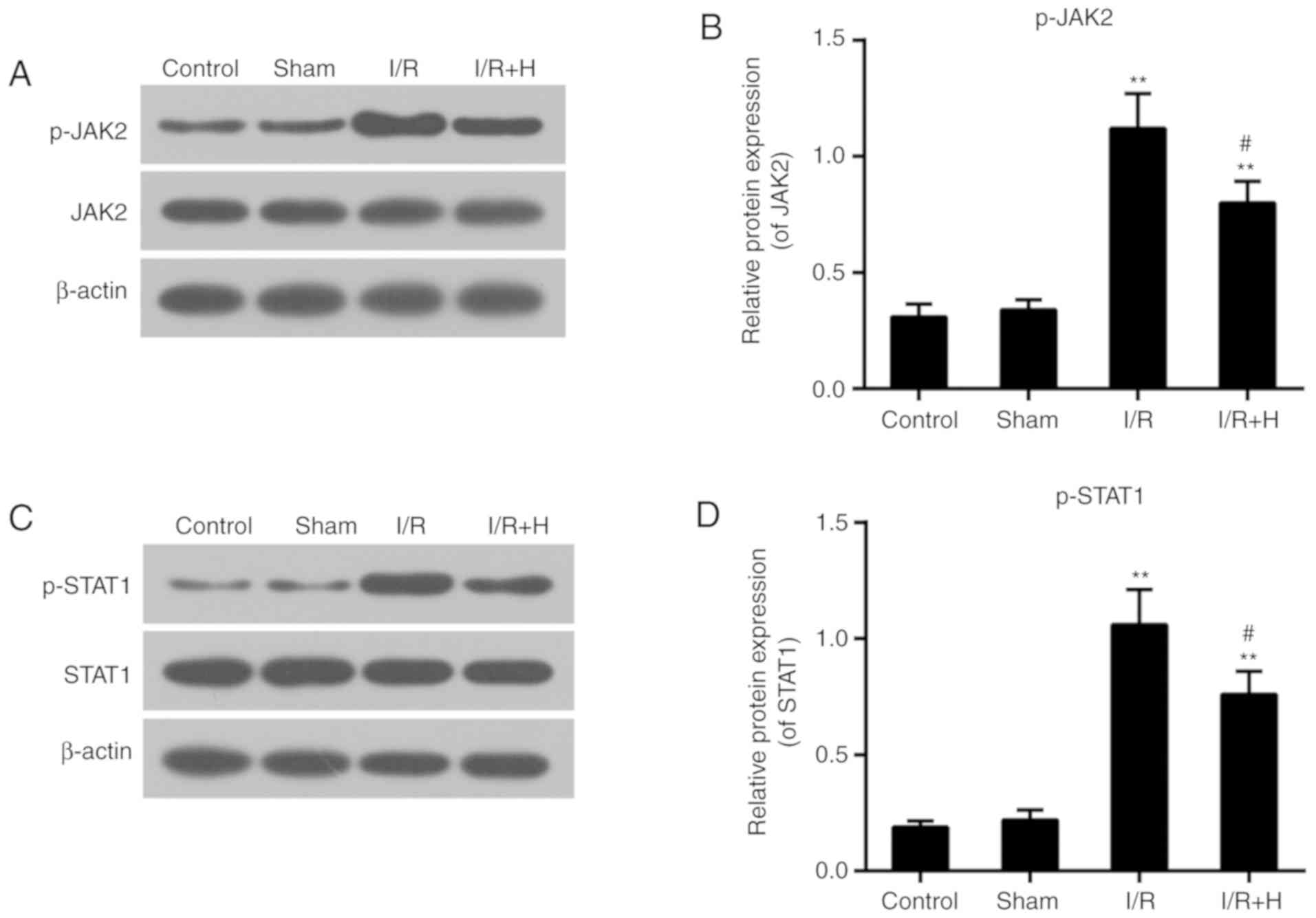 The expression levels of p-JAK2 and p-STAT1 were markedly increased in animals with I/R injury. No significant difference in the expression levels of total JAK2 and STAT1 between Sham and I/R group was identified. The administration of HSYA decreased the levels of p-JAK2 and p-STAT1 (Fig. 4A-D).