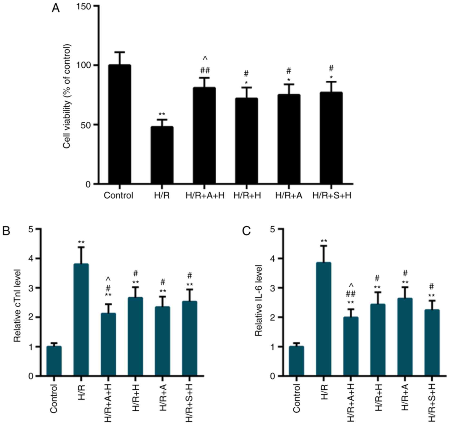 H9c2 cells (American Type Culture Collection, Manassas, VA, USA) were cultured in DMEM medium containing fetal bovine serum (10%) and streptomycin/penicillin (1%) in an incubator with 5% CO2. The cells were seeded at a density of 2.5×103 cell/well. The cells were randomly grouped as follows: i) Control group (control); ii) the hypoxia/reoxygenation group (H/R); iii) the H/R +20 µM HSYA group (H/R + H); iv) the H/R +10 µM AG490 group (H/R + A); v) the H/R +10 µM AG490 +20 µM HSYA (H/R + H + A) group; and vi) the H/R +5 µM S1491 +20 µM HSYA (H/R + H + S1491) group. As previously described and following our preliminary experiments, the doses of each agent were selected (29-32). The cells were collected for the following experiments.