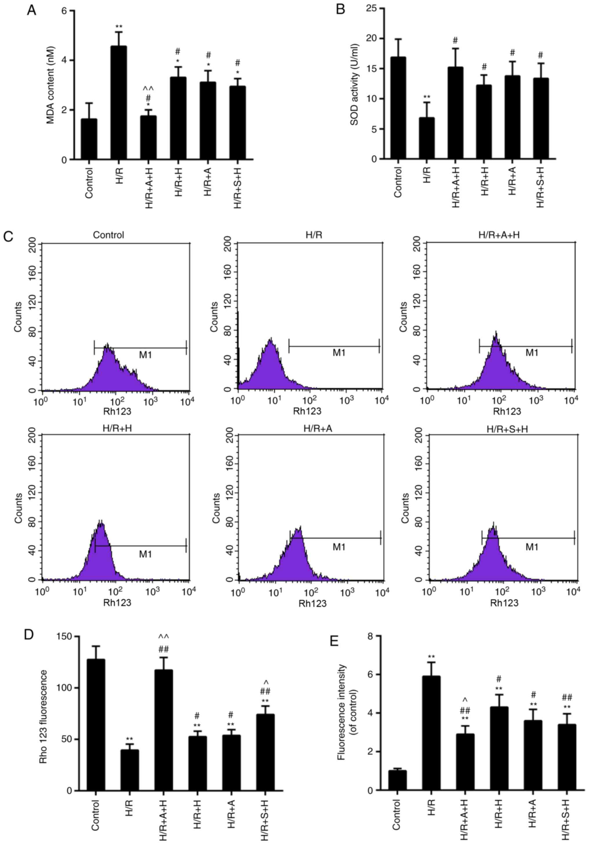 Data from the assays for MDA content and SOD activity demonstrated that I/R injury accelerated the rate of oxidative stress compared with the control. The MDA content and SOD activity were markedly decreased and recovered, respectively, in the group pretreated with HSYA. Although no significant difference was identified in the MDA content and SOD activity in H/R + S + H group when compared with those in the H/R + H group, the protective effects of HSYA were more significantly enhanced by the combined use with AG490 or S1491 (Fig. 6A and B). Loss of MMP may be associated with the disruption of redox status, which then leads to ROS-triggered oxidative stress. The results indicated that the loss of MMP was all partially alleviated in H/R + A + H, H/R + H, H/R + A and H/R + S + H groups, compared with the control group. Consistently, the ROS contents in these groups were decreased compared with those in the control group. The ROS level was significantly decreased in the H/R + A + H and H/R + S + H groups, compared with the H/R + H group. Although no significant difference was identified in the H/R + S + H group in comparison with that in the H/R + H group, the MMP level was also decreased in the H/R + A + H and H/R + S + H groups, compared with the H/R + H group (Fig. 6C-E).