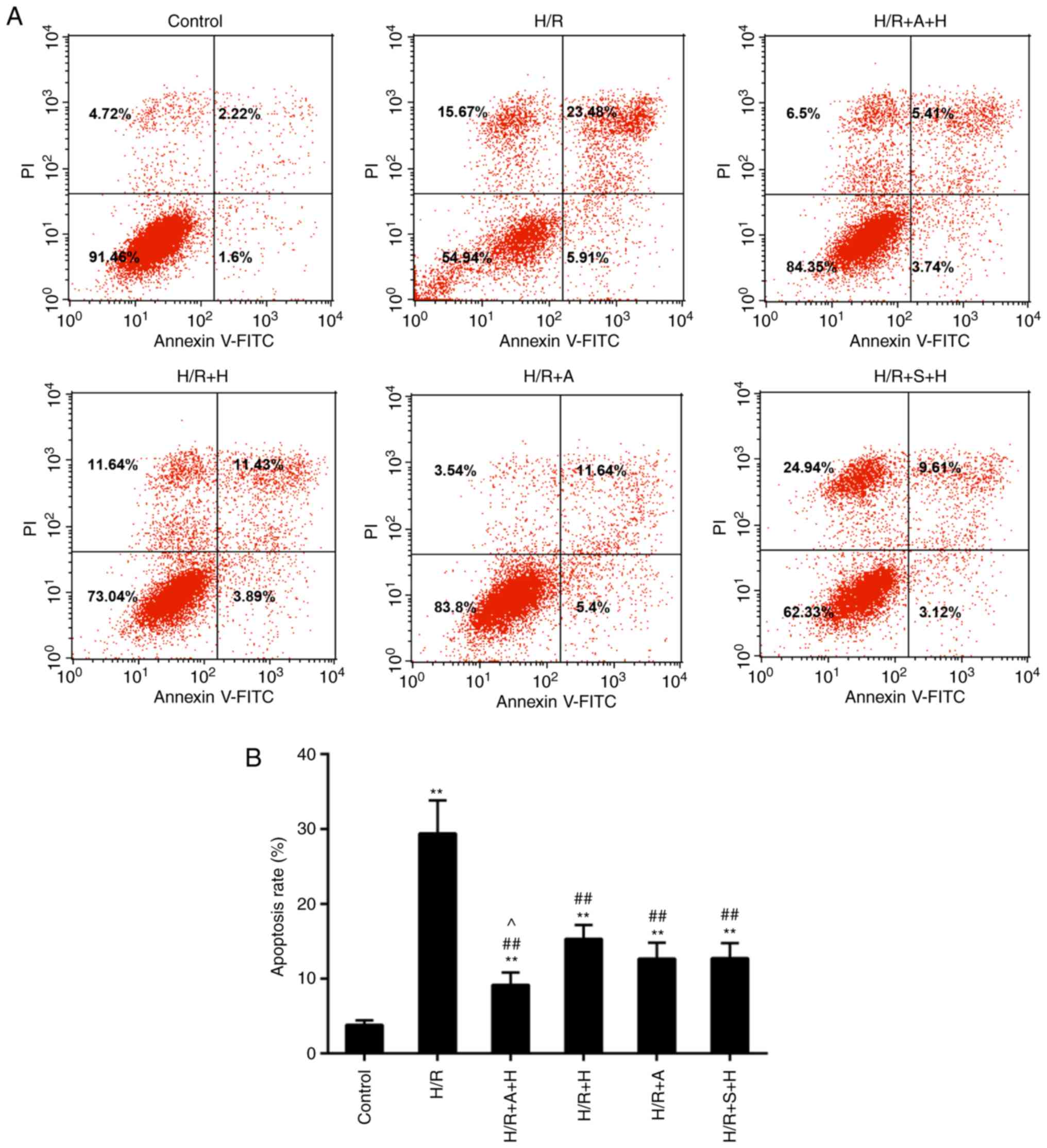 A terminal deoxynucleotidyl transferase-mediated dUTP nick-end labeling (TUNEL) assay and flow cytometry analysis were performed to detect the apoptosis levels in heart tissue and cardiomyocytes, respectively. The heart tissue was fixed in 4% paraformaldehyde for 10 min at room temperature and embedded in paraffin. The tissue was subsequently cut into 4-5 µm sections, and the slides were incubated with TUNEL mixture reagent (Sigma-Aldrich; Merck KGaA) at 37°C for 1 h. The cells were also incubated with DAPI (1 µg/ml) for 30 min at room temperature to stain the nuclei. ProLong™ Gold Antifade Mountant (cat. no. P36930; Thermo Fisher Scientific, Inc.) was used to prevent photo-bleaching. The apoptotic cells in ≥6 fields were randomly selected. The percentage of apop-tosis was calculated as the number of TUNEL-positive cells within the total populations of cardiomyocytes. The images and the ratios were obtained using an Olympus fluorescence microscope (BX51; Olympus Corporation, Tokyo, Japan) and ImageJ software (version 2.0.0; National Institutes of Health, Bethesda, MD, USA), respectively. An Annexin V-fluorescein isothiocyanate (FITC) and propidium iodide (PI) staining kit (BD Biosciences, San Jose, CA, USA) was used to assess cell apoptosis in vitro according to the manufacturer's protocols. The collected cells were stained with 5 µl Annexin V-FITC and 10 µl PI in the dark at room temperature for 10-15 min. Apoptosis was determined by a FACSCalibur flow cytometer (BD Biosciences) and analysis software BD CellQuest™ Pro Software version 1.2 (BD Biosciences).