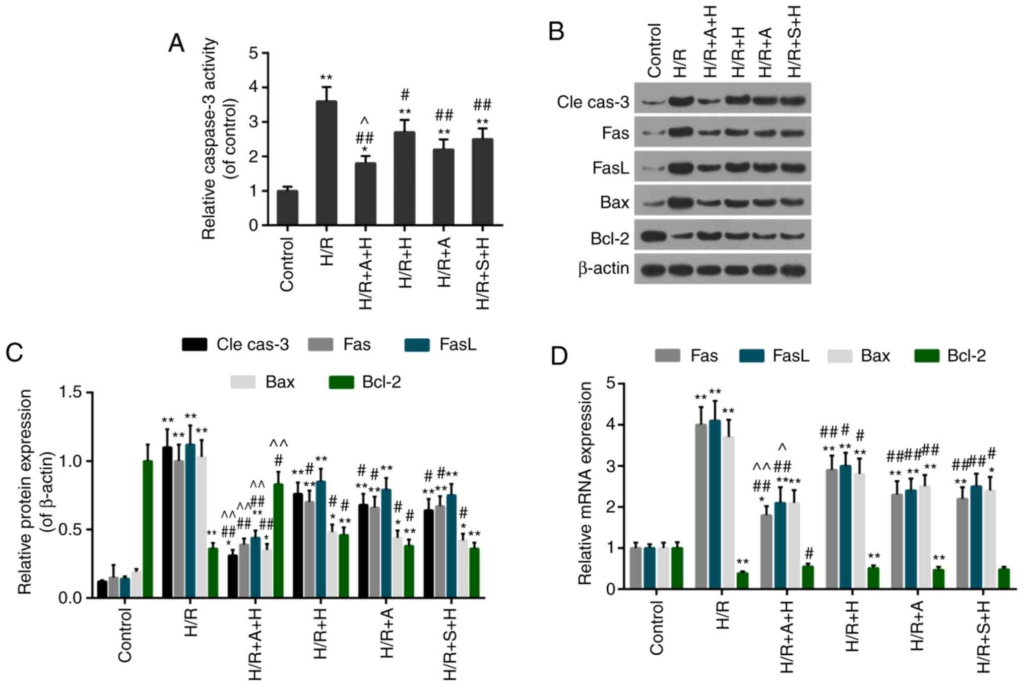 To confirm the effect of HSYA on apoptosis, the levels of apoptosis were detected by flow cytometry. The results revealed that the apoptosis rate was accelerated in the H/R group, while decreased cell apoptosis was identified in the H/R + A + H, H/R + H, HR + A and H/R + S + H groups compared with the H/R group (Fig. 7A and B). Furthermore, the caspase-3 activity was decreased in the H/R + A + H, H/R + H, HR + A and H/R + S + H groups compared with the H/R group (Fig. 8A). Additionally, the expression levels of apoptosis-associated factors were evaluated. The data from the in vitro analyses were compatible with those from the in vivo experiments, which demonstrated that the expression levels of pro-apoptotic proteins (cleaved caspase-3, Fas, FasL and Bax) were decreased and anti-apoptotic protein Bcl-2 was increased in the H/R + A + H, H/R + H, H/R + A and H/R + S + H groups compared with that in the H/R group (Fig. 8B and C). Similar results were obtained with regards to the mRNA expression levels of these apoptosis-associated factors (Fig. 8D). Therefore, the treatment with AG490/S1491 enhanced the protective effect of HSYA.