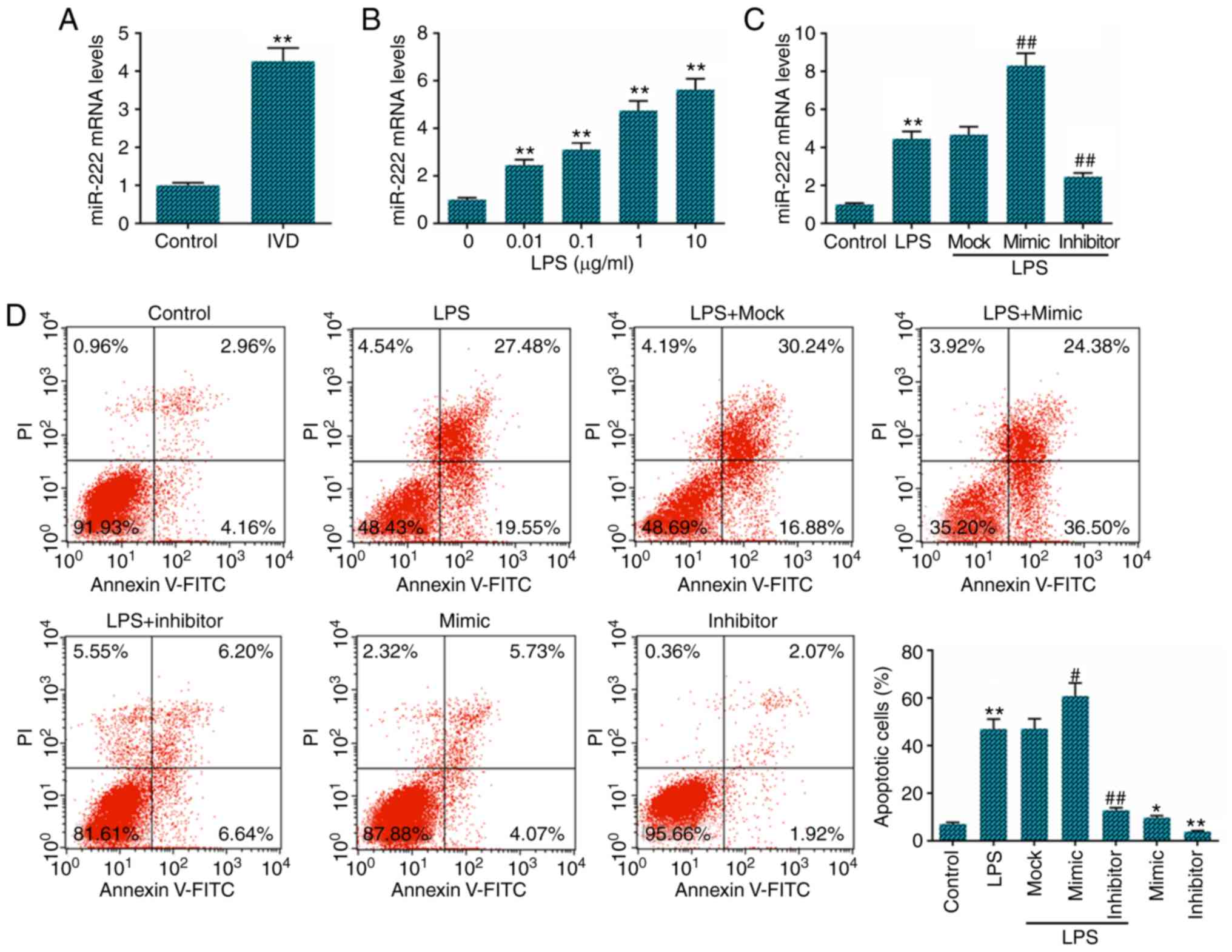 We determined the level of miR-222 in IVD tissues and an IVD cell model was generated using NP cells treated with LPS. The results revealed that miR-222 expression was significantly increased in IVD tissues (Fig. 1A) compared with the normal controls. Its expression was also increased in a dose-dependent manner in the LPS-treated NP cells (Fig. 1B). Following the referral to relevant literature and the experimental results, the concentration of 1 µg/ml LPS was selected for use in later experiments (27). To further examine the effect of miR-222 on LPS-induced NP cell apoptosis, miR-222 mock, mimics and inhibitor were transfected into the NP cells, and a high transfection efficiency was observed (Fig. 1C). The results of the flow cytometric analysis of apoptosis demonstrated that cell apoptosis was decreased in the miR-222 inhibitor-transfected NP cells compared with the LPS-treated cells, while miR-222 mimics exerted the opposite effect (Fig. 1D).