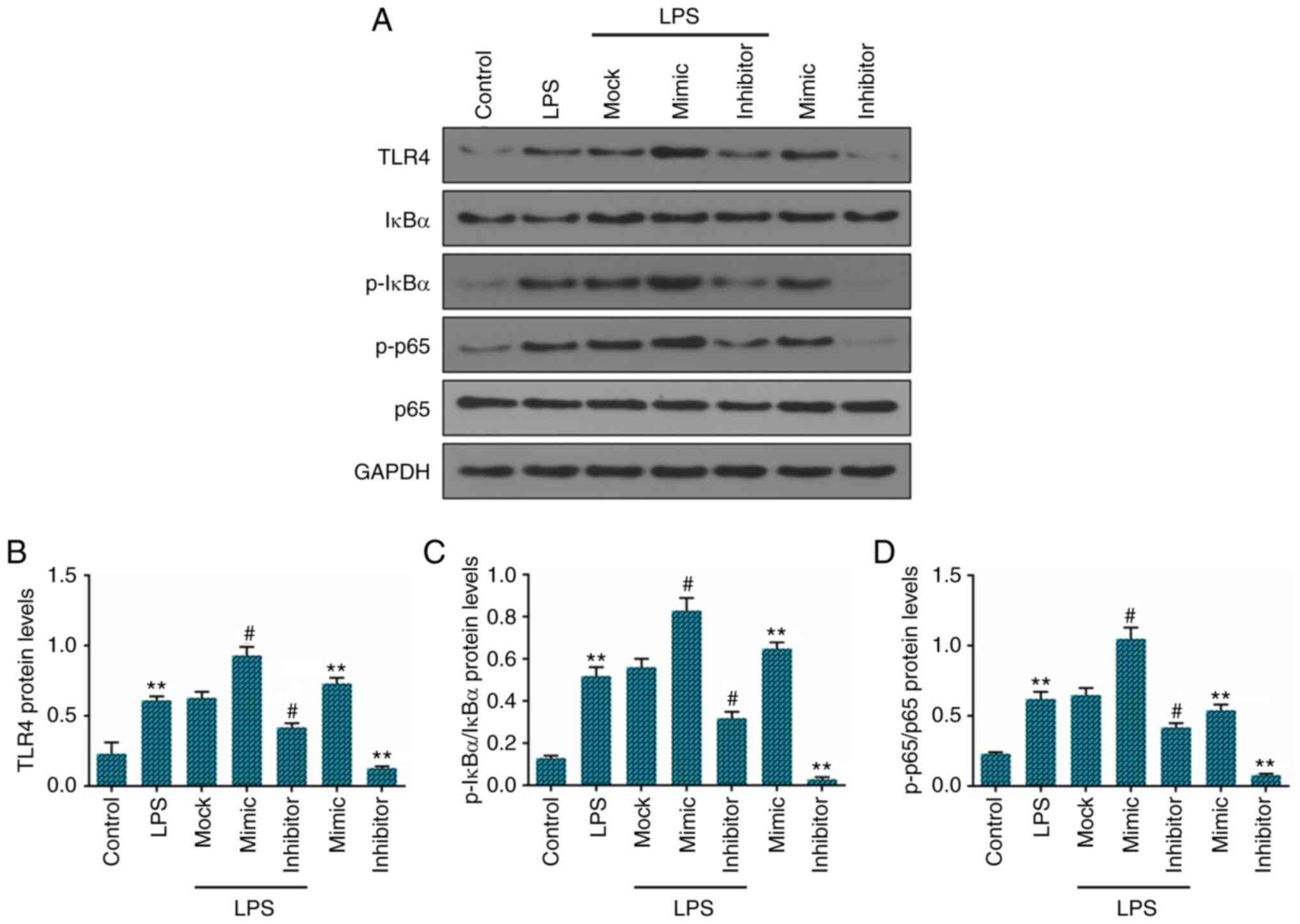In view of the significant role played by the TLR4/NF-κB signaling pathway in the progression of IVD, we assessed the expression of TLR4 and the phosphorylation levels of IκBα and p65 in human NP cells stimulated with LPS by western blot analysis. The results demonstrated that the levels of TLR4, p-IκBα and p-p65 were significantly higher in the LPS-treated NP cells than those in the control NP cells. Transfection with miR-222 mimics significantly upregulated the TLR4, p-IκBα and p-p65 expression levels in NP cells, while transfection with miR-222 inhibitor markedly down-regulated the TLR4, p-IκBα and p-p65 levels, when compared with the cells stimulated with LPS only (Fig. 3A). The relative protein levels of TLR4, p-IκBα and p-p65 in NP cells are presented in Fig. 3B-D).