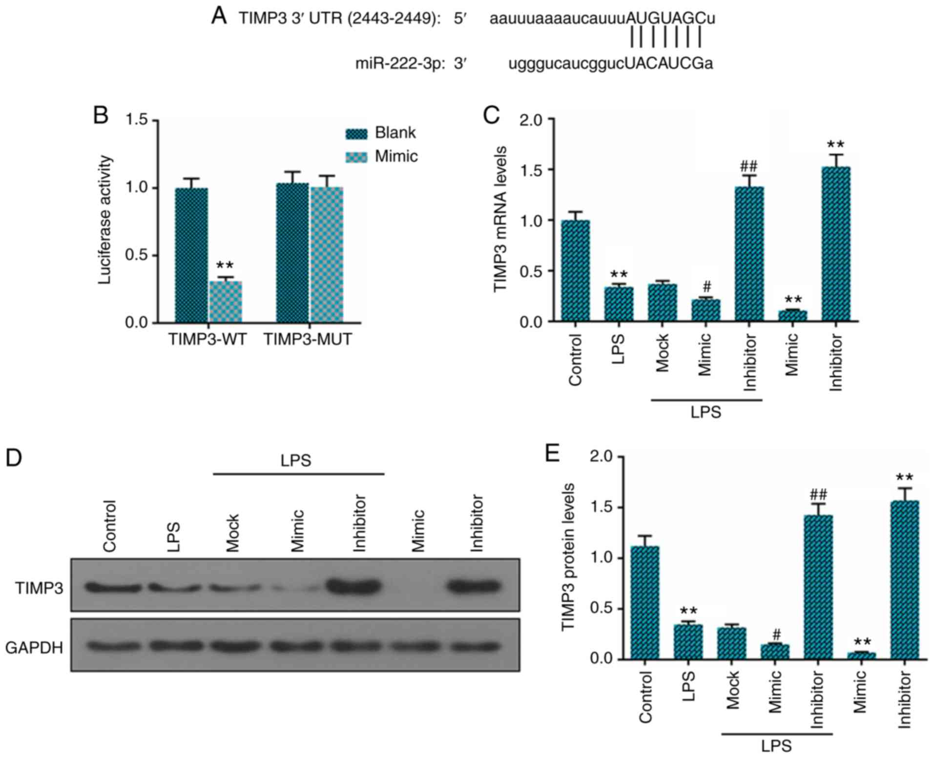 miR-222 mimic (5′-AGC UAC AUC UGG CUA CUG GGU-3′), inhibitor (5′-AGC UAC AUU GUC UGC UGG GUU UC-3′) and mock (5′-UCU ACU CUU UCU AGG AGG UUG UGA-3′), which was the negative control used for the transfection of miR-222 mimics and inhibitors, were obtained from GenePharma. TIMP3-siRNA (cat. no. AM16708) and TIMP3-siNC (cat. no. AM4611) were obtained from Ambion (Thermo Fisher Scientific). LPS was purchased from Sigma-Aldrich (cat. no. L2630).